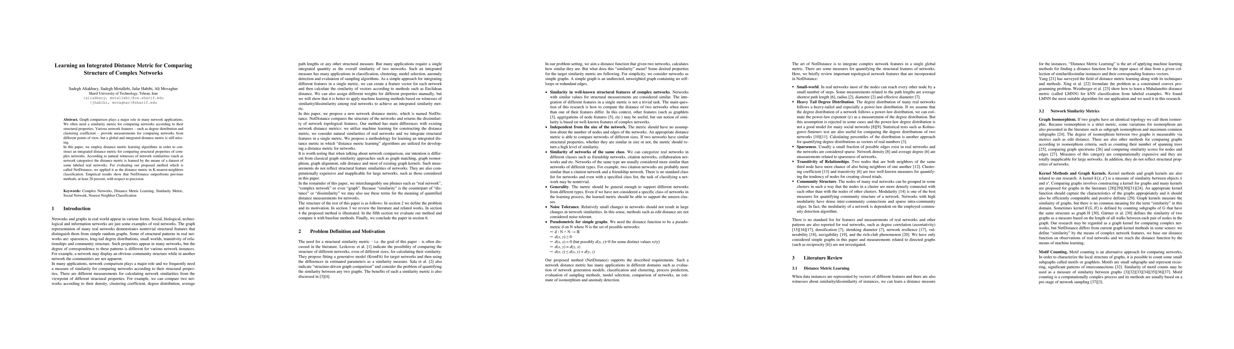 Graph comparison plays a major role in many network applications. We often need a similarity metric for comparing networks according to their structural properties. Various network features - such as degree distribution and clustering coefficient - provide measurements for comparing networks from different points of view, but a global and integrated distance metric is still missing. In this paper, we employ distance metric learning algorithms in order to construct an integrated distance metric for comparing structural properties of complex networks. According to natural witnesses of network similarities (such as network categories) the distance metric is learned by the means of a dataset of some labeled real networks. For evaluating our proposed method which is called NetDistance, we applied it as the distance metric in K-nearest-neighbors classification. Empirical results show that NetDistance outperforms previous methods, at least 20 percent, with respect to precision.