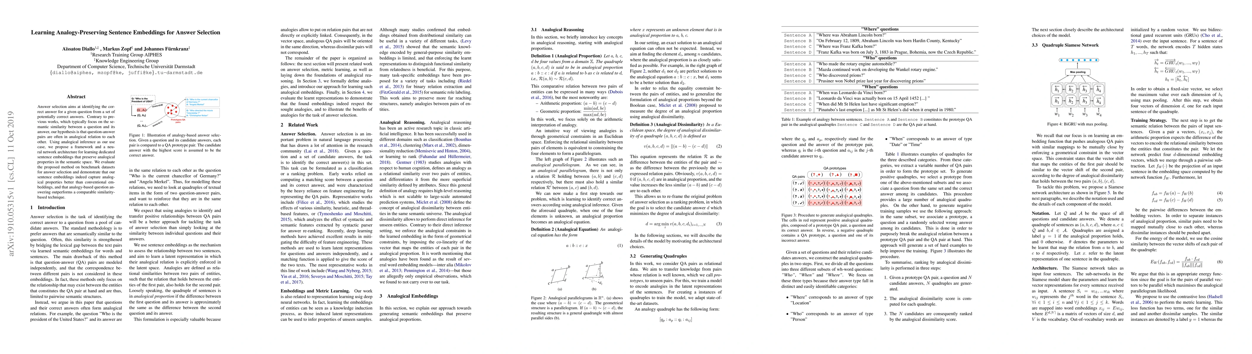 This paper proposes a framework for learning sentence embeddings that preserve analogical relations for answer selection, demonstrating improved performance over conventional similarity-based methods. The method is evaluated on benchmark datasets, showing better analogical property capture and superior question-answer matching.