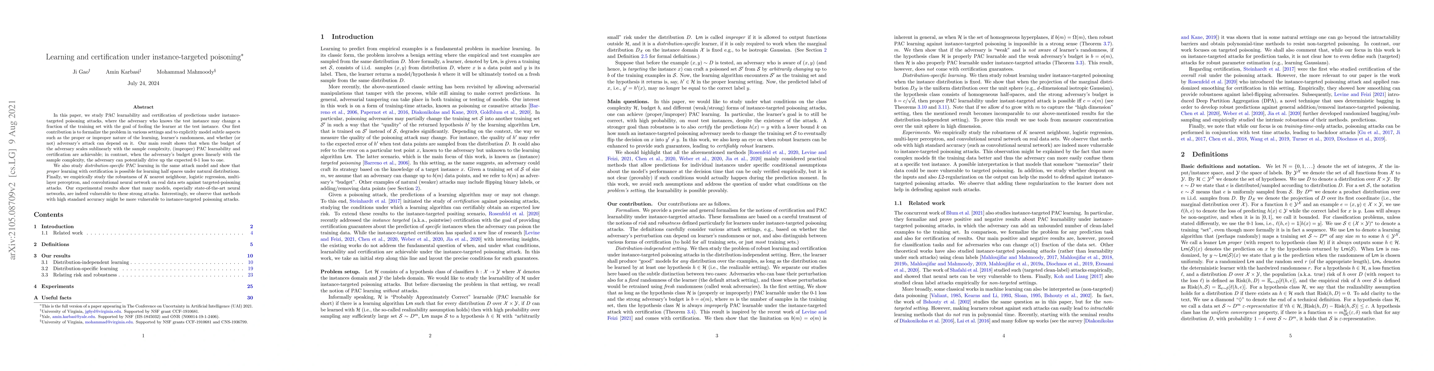 In this paper, we study PAC learnability and certification of predictions under instance-targeted poisoning attacks, where the adversary who knows the test instance may change a fraction of the training set with the goal of fooling the learner at the test instance. Our first contribution is to formalize the problem in various settings and to explicitly model subtle aspects such as the proper or improper nature of the learning, learner's randomness, and whether (or not) adversary's attack can depend on it. Our main result shows that when the budget of the adversary scales sublinearly with the sample complexity, (improper) PAC learnability and certification are achievable; in contrast, when the adversary's budget grows linearly with the sample complexity, the adversary can potentially drive up the expected 0-1 loss to one. We also study distribution-specific PAC learning in the same attack model and show that proper learning with certification is possible for learning half spaces under natural distributions. Finally, we empirically study the robustness of K nearest neighbour, logistic regression, multi-layer perceptron, and convolutional neural network on real data sets against targeted-poisoning attacks. Our experimental results show that many models, especially state-of-the-art neural networks, are indeed vulnerable to these strong attacks. Interestingly, we observe that methods with high standard accuracy might be more vulnerable to instance-targeted poisoning attacks.
