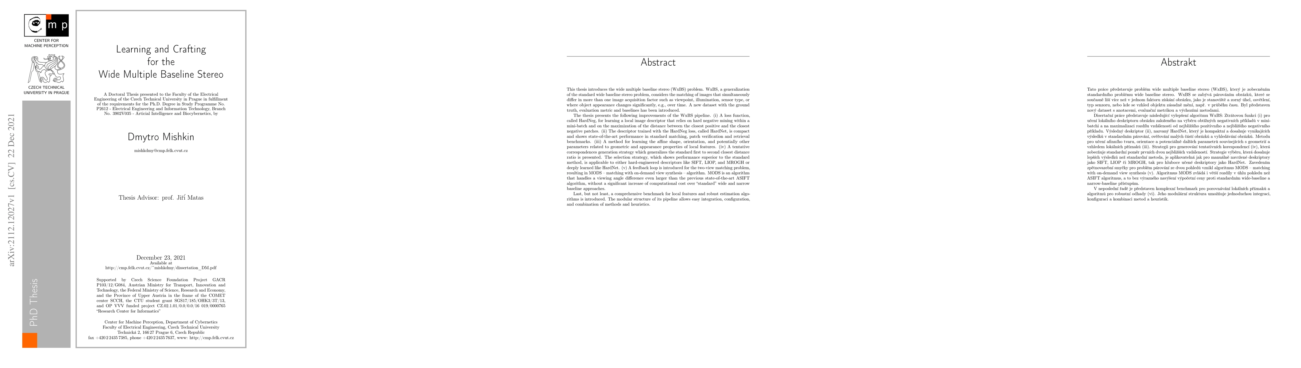 This thesis addresses the wide multiple baseline stereo (WxBS) problem, introducing a new dataset and evaluation metrics. It proposes several improvements including a HardNeg loss function for learning robust local image descriptors, a new descriptor called HardNet, and a feedback loop algorithm called MODS for enhanced two-view matching, all contributing to state-of-the-art performance in various benchmarks.