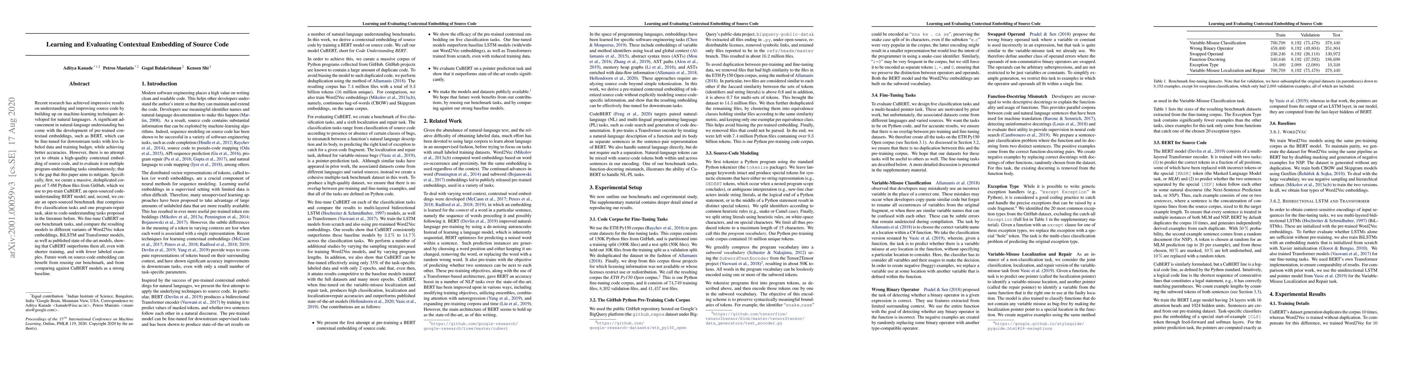 Recent research has achieved impressive results on understanding and improving source code by building up on machine-learning techniques developed for natural languages. A significant advancement in natural-language understanding has come with the development of pre-trained contextual embeddings, such as BERT, which can be fine-tuned for downstream tasks with less labeled data and training budget, while achieving better accuracies. However, there is no attempt yet to obtain a high-quality contextual embedding of source code, and to evaluate it on multiple program-understanding tasks simultaneously; that is the gap that this paper aims to mitigate. Specifically, first, we curate a massive, deduplicated corpus of 7.4M Python files from GitHub, which we use to pre-train CuBERT, an open-sourced code-understanding BERT model; and, second, we create an open-sourced benchmark that comprises five classification tasks and one program-repair task, akin to code-understanding tasks proposed in the literature before. We fine-tune CuBERT on our benchmark tasks, and compare the resulting models to different variants of Word2Vec token embeddings, BiLSTM and Transformer models, as well as published state-of-the-art models, showing that CuBERT outperforms them all, even with shorter training, and with fewer labeled examples. Future work on source-code embedding can benefit from reusing our benchmark, and from comparing against CuBERT models as a strong baseline.