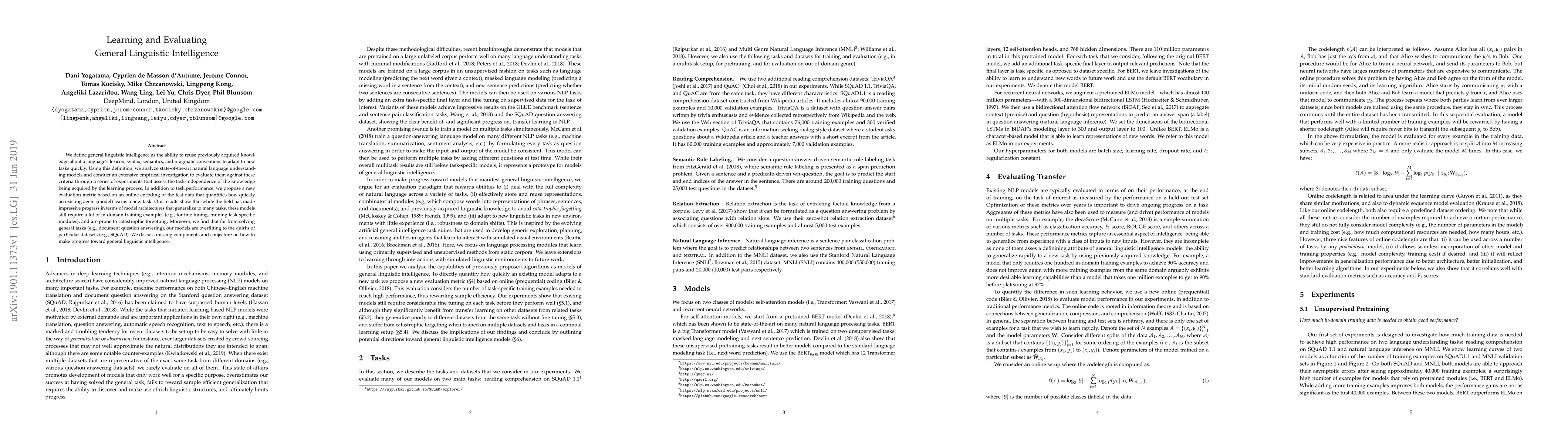 We define general linguistic intelligence as the ability to reuse previously acquired knowledge about a language's lexicon, syntax, semantics, and pragmatic conventions to adapt to new tasks quickly. Using this definition, we analyze state-of-the-art natural language understanding models and conduct an extensive empirical investigation to evaluate them against these criteria through a series of experiments that assess the task-independence of the knowledge being acquired by the learning process. In addition to task performance, we propose a new evaluation metric based on an online encoding of the test data that quantifies how quickly an existing agent (model) learns a new task. Our results show that while the field has made impressive progress in terms of model architectures that generalize to many tasks, these models still require a lot of in-domain training examples (e.g., for fine tuning, training task-specific modules), and are prone to catastrophic forgetting. Moreover, we find that far from solving general tasks (e.g., document question answering), our models are overfitting to the quirks of particular datasets (e.g., SQuAD). We discuss missing components and conjecture on how to make progress toward general linguistic intelligence.
