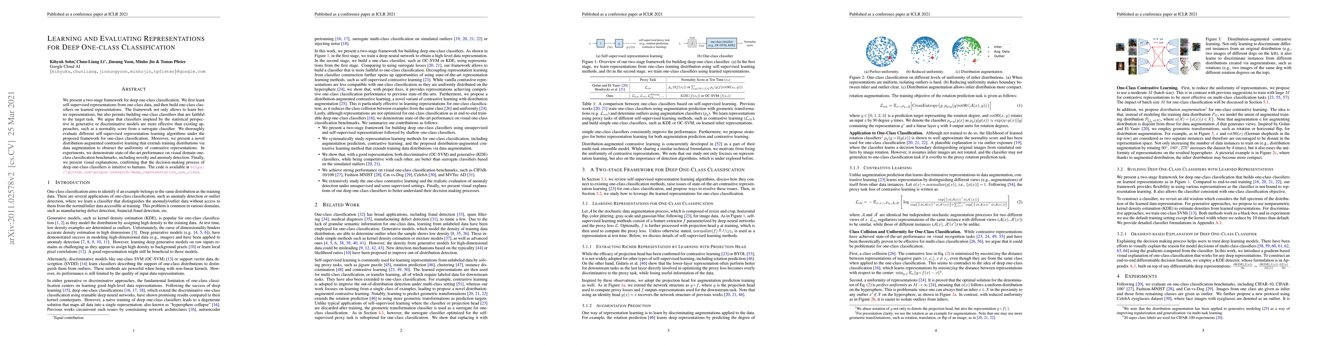 This paper introduces a two-stage framework for deep one-class classification, utilizing self-supervised learning to enhance representation and build effective one-class classifiers. The proposed method achieves state-of-the-art results in visual domain benchmarks, demonstrating improved performance and interpretability.