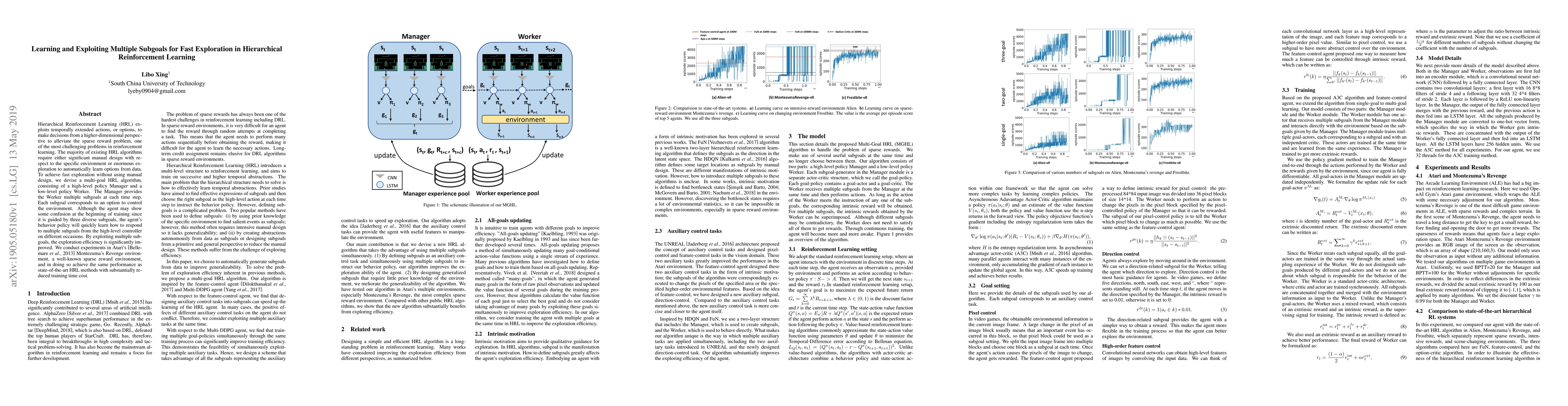 This paper proposes a multi-goal hierarchical Reinforcement Learning (HRL) algorithm that uses a Manager-Worker framework to achieve fast exploration without manual design. The Manager provides multiple subgoals to the Worker, which improves exploration efficiency and reduces training time, demonstrated effectively in the sparse reward environment of Atari's Montezuma's Revenge.