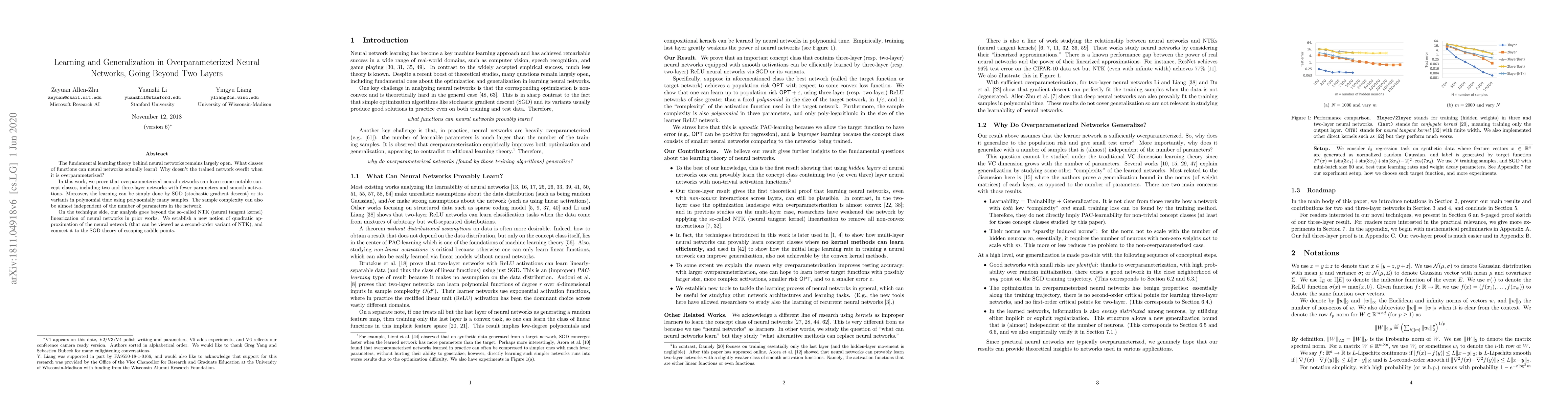 The fundamental learning theory behind neural networks remains largely open. What classes of functions can neural networks actually learn? Why doesn't the trained network overfit when it is overparameterized? In this work, we prove that overparameterized neural networks can learn some notable concept classes, including two and three-layer networks with fewer parameters and smooth activations. Moreover, the learning can be simply done by SGD (stochastic gradient descent) or its variants in polynomial time using polynomially many samples. The sample complexity can also be almost independent of the number of parameters in the network. On the technique side, our analysis goes beyond the so-called NTK (neural tangent kernel) linearization of neural networks in prior works. We establish a new notion of quadratic approximation of the neural network (that can be viewed as a second-order variant of NTK), and connect it to the SGD theory of escaping saddle points.