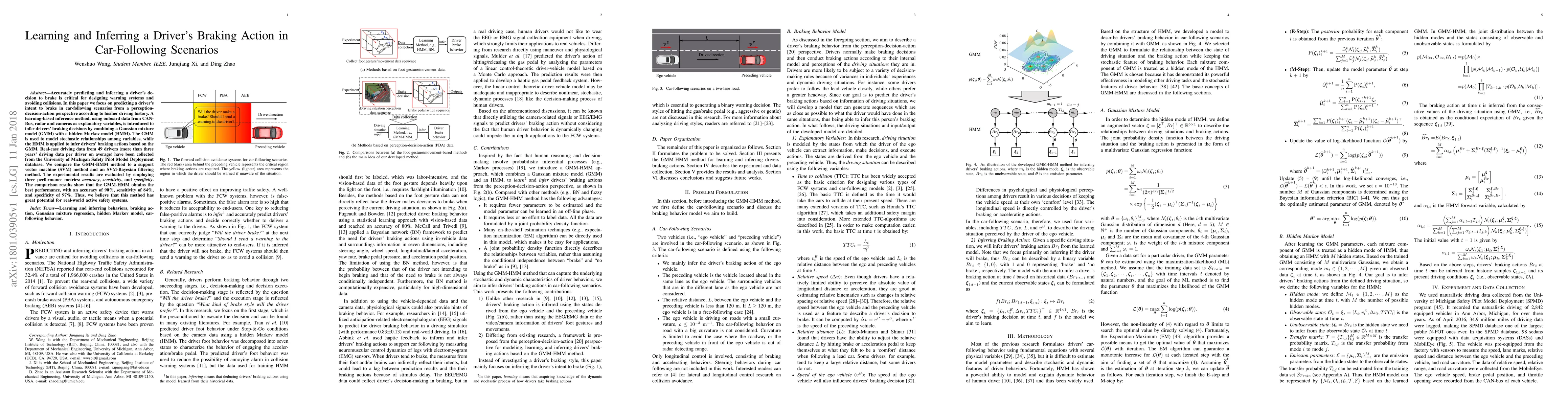 Accurately predicting and inferring a driver's decision to brake is critical for designing warning systems and avoiding collisions. In this paper we focus on predicting a driver's intent to brake in car-following scenarios from a perception-decision-action perspective according to his/her driving history. A learning-based inference method, using onboard data from CAN-Bus, radar and cameras as explanatory variables, is introduced to infer drivers' braking decisions by combining a Gaussian mixture model (GMM) with a hidden Markov model (HMM). The GMM is used to model stochastic relationships among variables, while the HMM is applied to infer drivers' braking actions based on the GMM. Real-case driving data from 49 drivers (more than three years' driving data per driver on average) have been collected from the University of Michigan Safety Pilot Model Deployment database. We compare the GMM-HMM method to a support vector machine (SVM) method and an SVM-Bayesian filtering method. The experimental results are evaluated by employing three performance metrics: accuracy, sensitivity, specificity. The comparison results show that the GMM-HMM obtains the best performance, with an accuracy of 90%, sensitivity of 84%, and specificity of 97%. Thus, we believe that this method has great potential for real-world active safety systems.