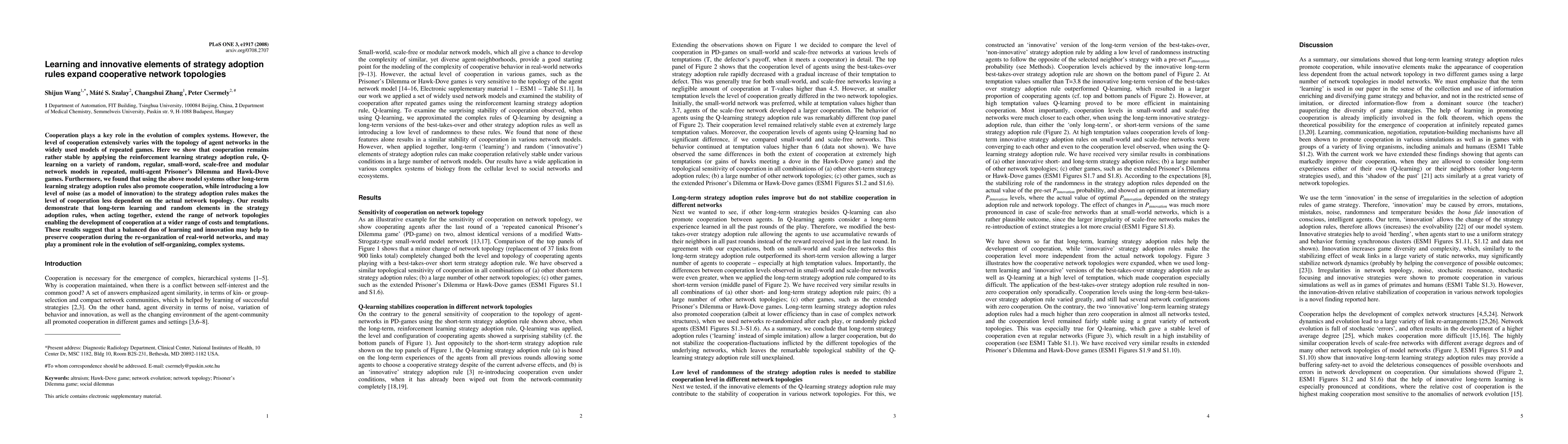 Cooperation plays a key role in the evolution of complex systems. However, the level of cooperation extensively varies with the topology of agent networks in the widely used models of repeated games. Here we show that cooperation remains rather stable by applying the reinforcement learning strategy adoption rule, Q-learning on a variety of random, regular, small-word, scale-free and modular network models in repeated, multi-agent Prisoners Dilemma and Hawk-Dove games. Furthermore, we found that using the above model systems other long-term learning strategy adoption rules also promote cooperation, while introducing a low level of noise (as a model of innovation) to the strategy adoption rules makes the level of cooperation less dependent on the actual network topology. Our results demonstrate that long-term learning and random elements in the strategy adoption rules, when acting together, extend the range of network topologies enabling the development of cooperation at a wider range of costs and temptations. These results suggest that a balanced duo of learning and innovation may help to preserve cooperation during the re-organization of real-world networks, and may play a prominent role in the evolution of self-organizing, complex systems.