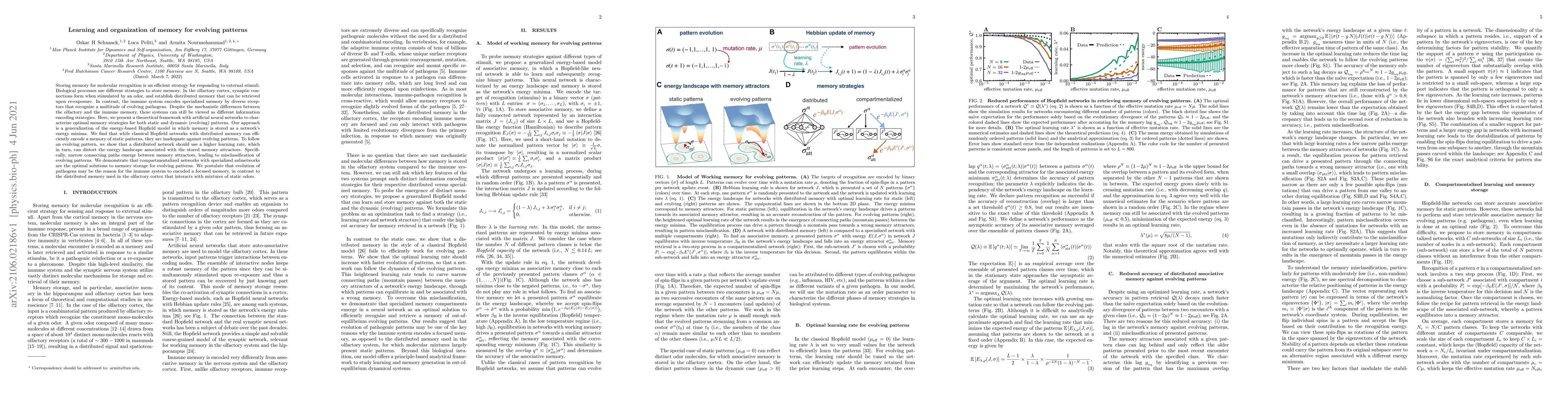 Storing memory for molecular recognition is an efficient strategy for responding to external stimuli. Biological processes use different strategies to store memory. In the olfactory cortex, synaptic connections form when stimulated by an odor, and establish distributed memory that can be retrieved upon re-exposure. In contrast, the immune system encodes specialized memory by diverse receptors that recognize a multitude of evolving pathogens. Despite the mechanistic differences between the olfactory and the immune memory, these systems can still be viewed as different information encoding strategies. Here, we present a theoretical framework with artificial neural networks to characterize optimal memory strategies for both static and dynamic (evolving) patterns. Our approach is a generalization of the energy-based Hopfield model in which memory is stored as a network's energy minima. We find that while classical Hopfield networks with distributed memory can efficiently encode a memory of static patterns, they are inadequate against evolving patterns. To follow an evolving pattern, we show that a distributed network should use a higher learning rate, which in turn, can distort the energy landscape associated with the stored memory attractors. Specifically, narrow connecting paths emerge between memory attractors, leading to misclassification of evolving patterns. We demonstrate that compartmentalized networks with specialized subnetworks are the optimal solutions to memory storage for evolving patterns. We postulate that evolution of pathogens may be the reason for the immune system to encoded a focused memory, in contrast to the distributed memory used in the olfactory cortex that interacts with mixtures of static odors.