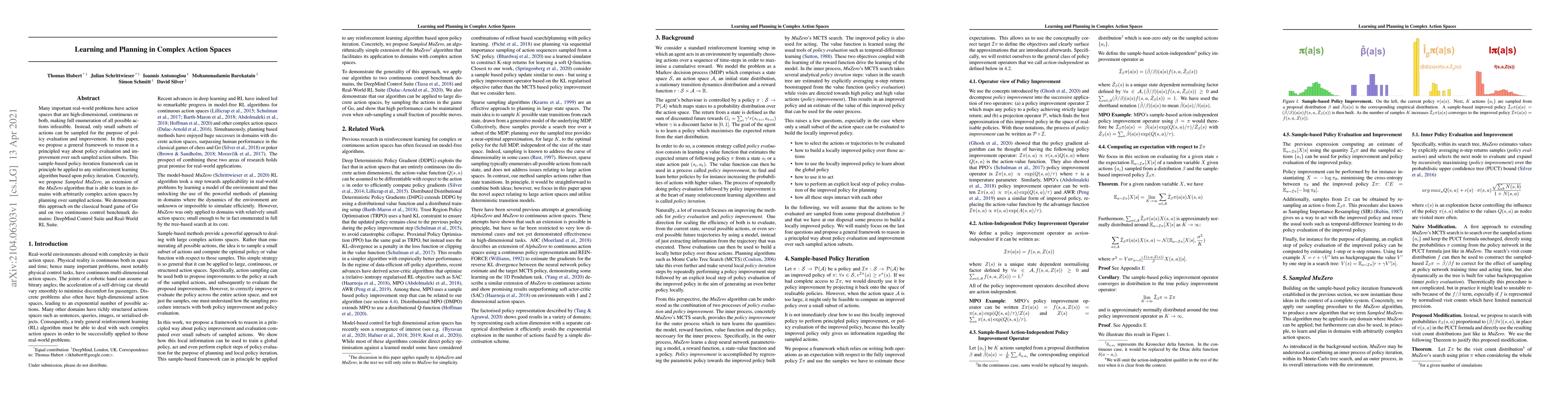 This paper proposes a sample-based policy iteration framework for reinforcement learning in complex action spaces, introducing Sampled MuZero to enable learning in high-dimensional domains. The approach is demonstrated through applications in Go and continuous control tasks.