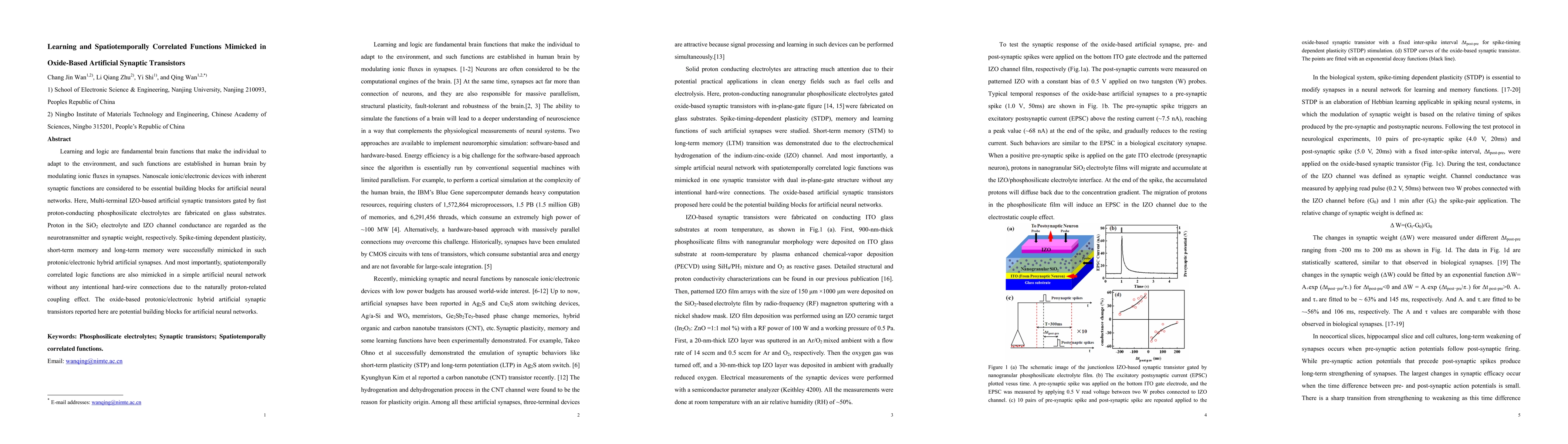 This paper reports the fabrication of multi-terminal oxide-based artificial synaptic transistors that mimic learning and spatiotemporally correlated functions using protonic/electronic hybrid mechanisms. These devices demonstrate spike-timing dependent plasticity, memory, and logic functions without hard-wired connections.
