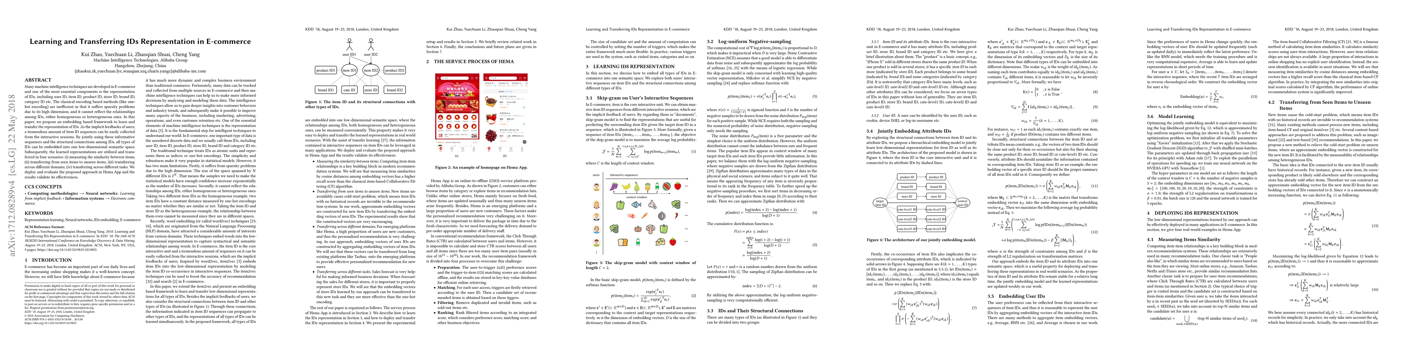 This paper proposes an embedding-based framework to learn and transfer representations of various IDs in e-commerce, addressing the inefficiencies of classical encoding methods. The approach leverages item ID sequences and structural connections to embed IDs into a low-dimensional semantic space, demonstrating effectiveness in similarity measurement, transfer learning across domains and tasks.