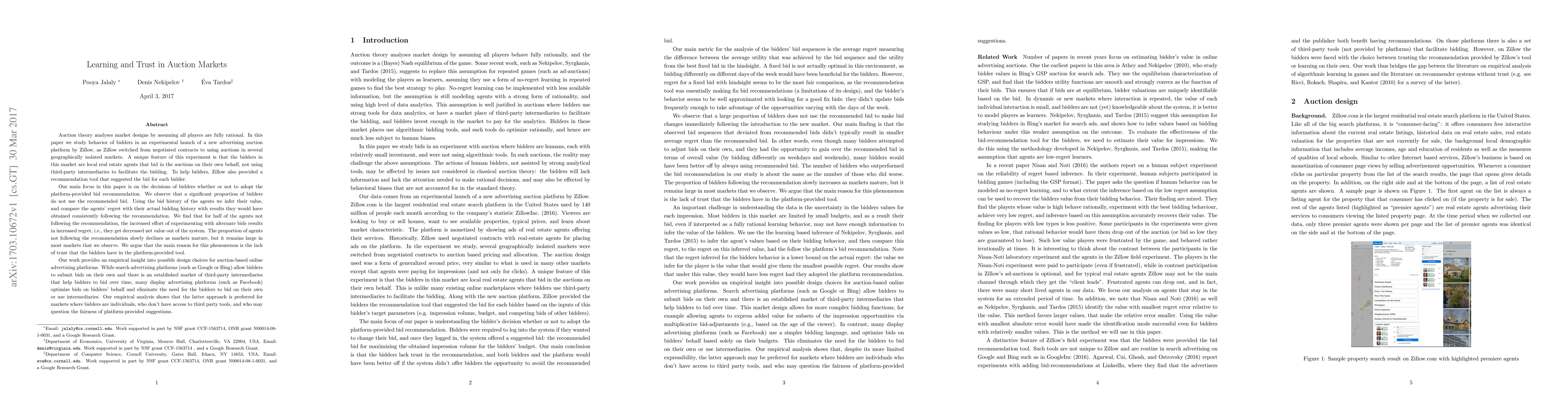 This study examines real estate agents' behavior in Zillow's new auction platform. Despite a tool suggesting bids, many agents didn't use it, indicating a lack of trust. The research found that agents who deviated from the recommendation often experienced higher regret, suggesting the platform's suggested bids were more valuable. The paper implies that for display ad platforms, where bidders lack third-party tools, direct bid optimization by the platform might be preferable, unlike search platforms where individual bidders submit their own bids.