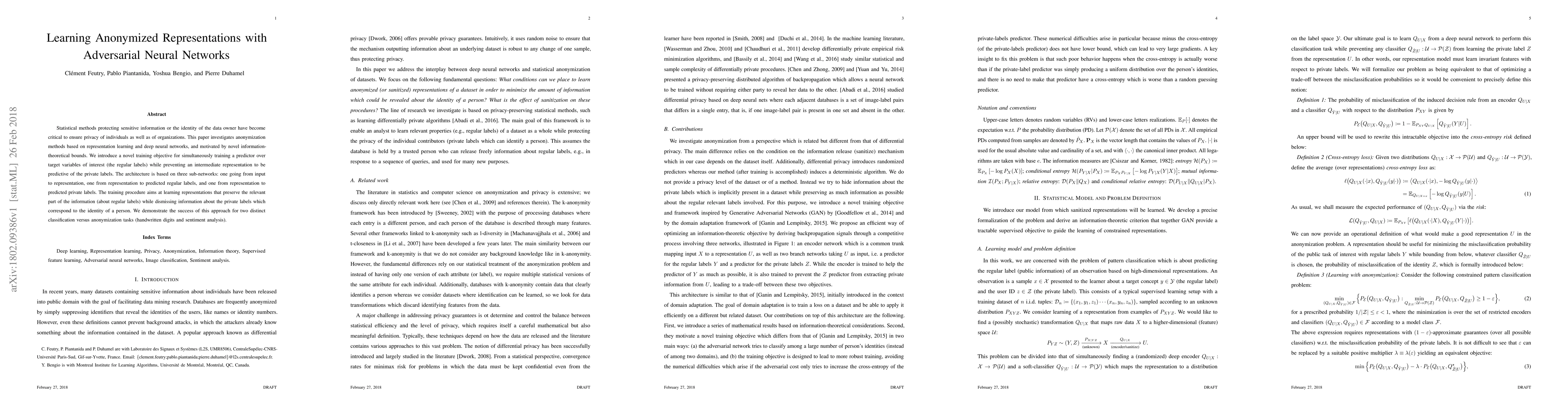 This paper introduces a novel training objective to learn anonymized representations using adversarial neural networks, successfully demonstrating its approach for two classification versus anonymization tasks: handwritten digits and sentiment analysis.