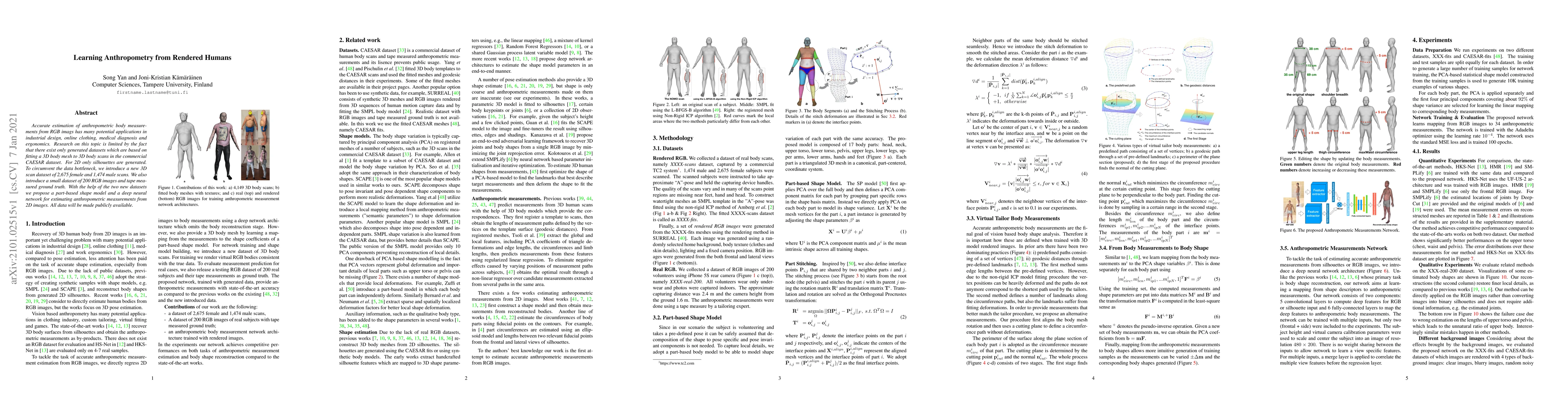 Accurate estimation of anthropometric body measurements from RGB images has many potential applications in industrial design, online clothing, medical diagnosis and ergonomics. Research on this topic is limited by the fact that there exist only generated datasets which are based on fitting a 3D body mesh to 3D body scans in the commercial CAESAR dataset. For 2D only silhouettes are generated. To circumvent the data bottleneck, we introduce a new 3D scan dataset of 2,675 female and 1,474 male scans. We also introduce a small dataset of 200 RGB images and tape measured ground truth. With the help of the two new datasets we propose a part-based shape model and a deep neural network for estimating anthropometric measurements from 2D images. All data will be made publicly available.