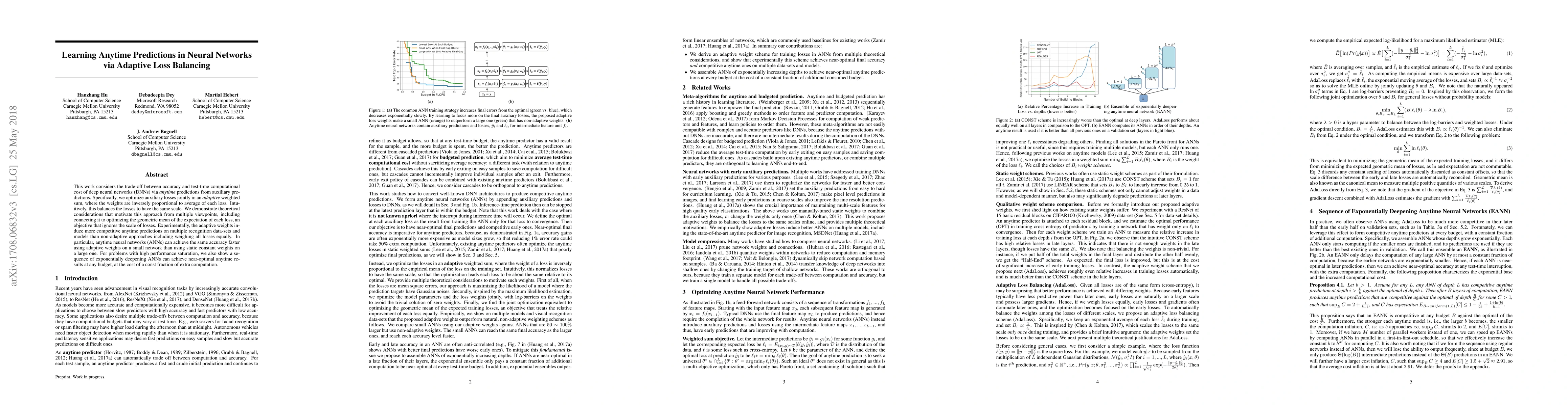 This paper proposes an adaptive loss balancing method for neural networks to optimize anytime predictions, achieving higher accuracy with lower computational costs. The adaptive weights adjust based on the average of each loss, leading to competitive performance across various datasets and models compared to non-adaptive methods.