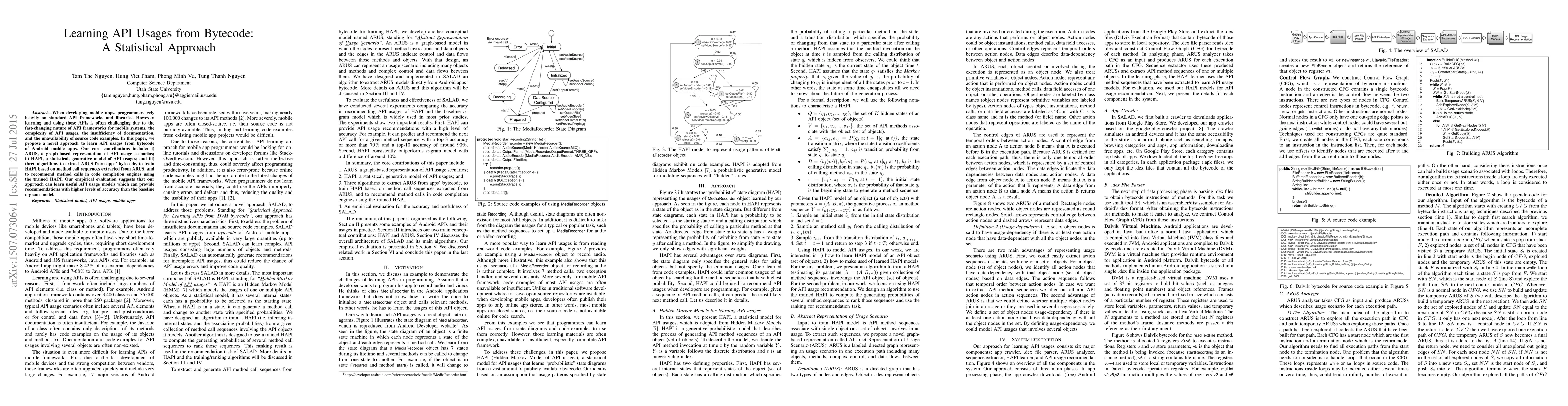 This paper proposes a statistical method to learn API usages from Android app bytecode, introducing ARUS for graph-based API usage representation and HAPI for a generative model. The approach includes algorithms for extracting usage patterns and improving code completion recommendations, outperforming baseline n-gram models.