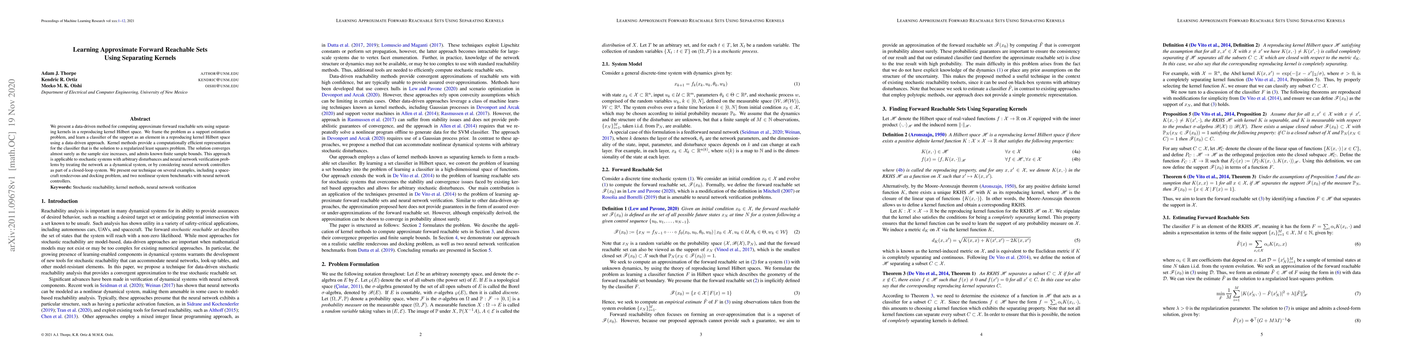 This paper introduces a data-driven method for computing approximate forward reachable sets using separating kernels in a reproducing kernel Hilbert space, framing it as a support estimation problem. The approach leverages kernel methods for efficient computation and demonstrates applicability to stochastic systems and neural network verification.