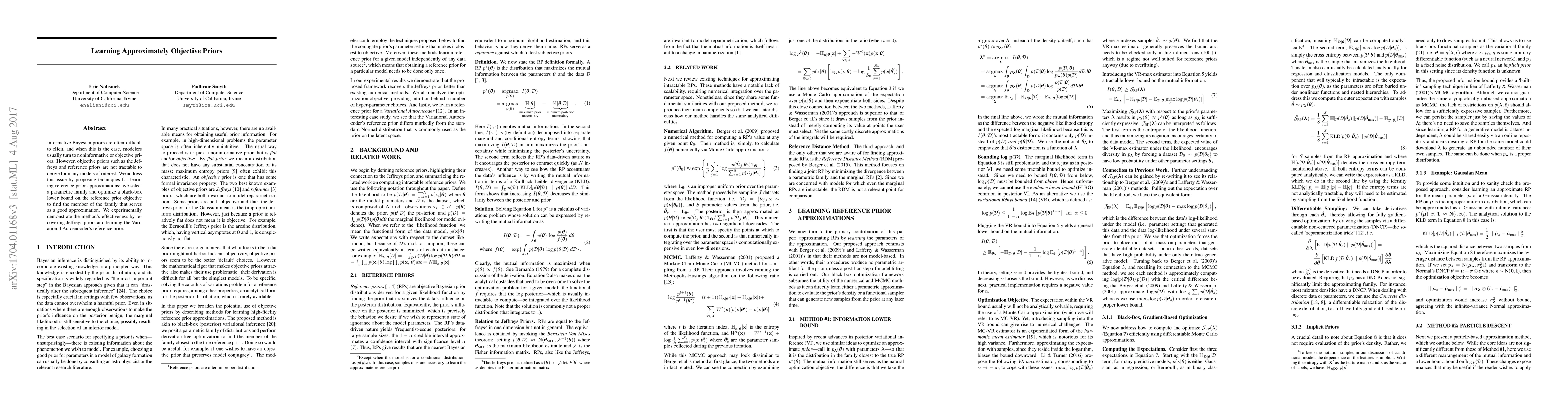 This paper proposes techniques for learning approximate reference priors by selecting a parametric family and optimizing a lower bound on the reference prior objective. The method is demonstrated to effectively recover known priors like Jeffreys priors and determine the Variational Autoencoder's reference prior.