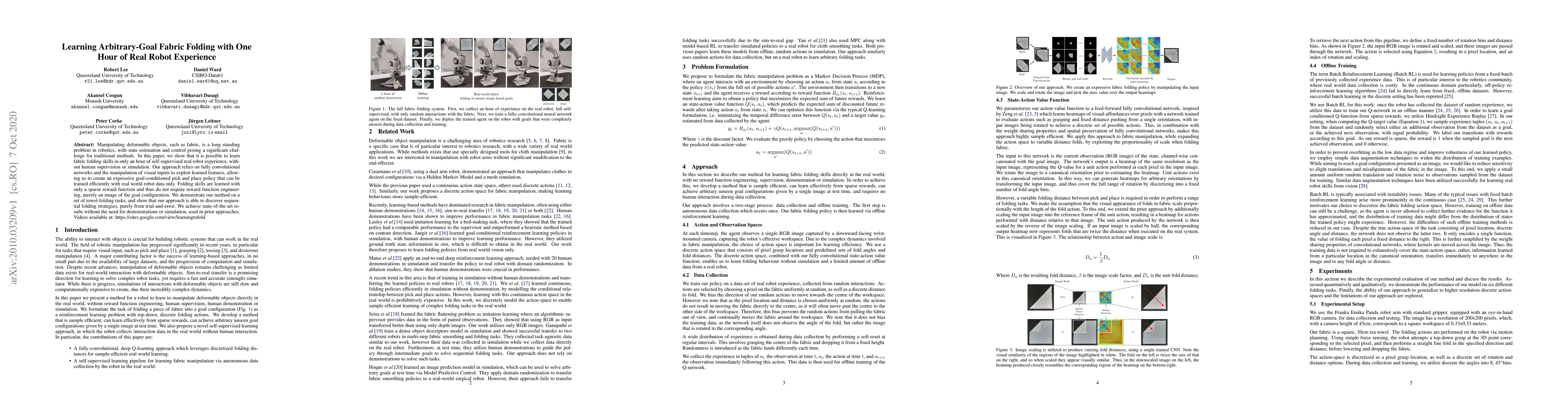 Manipulating deformable objects, such as fabric, is a long standing problem in robotics, with state estimation and control posing a significant challenge for traditional methods. In this paper, we show that it is possible to learn fabric folding skills in only an hour of self-supervised real robot experience, without human supervision or simulation. Our approach relies on fully convolutional networks and the manipulation of visual inputs to exploit learned features, allowing us to create an expressive goal-conditioned pick and place policy that can be trained efficiently with real world robot data only. Folding skills are learned with only a sparse reward function and thus do not require reward function engineering, merely an image of the goal configuration. We demonstrate our method on a set of towel-folding tasks, and show that our approach is able to discover sequential folding strategies, purely from trial-and-error. We achieve state-of-the-art results without the need for demonstrations or simulation, used in prior approaches. Videos available at: https://sites.google.com/view/learningtofold