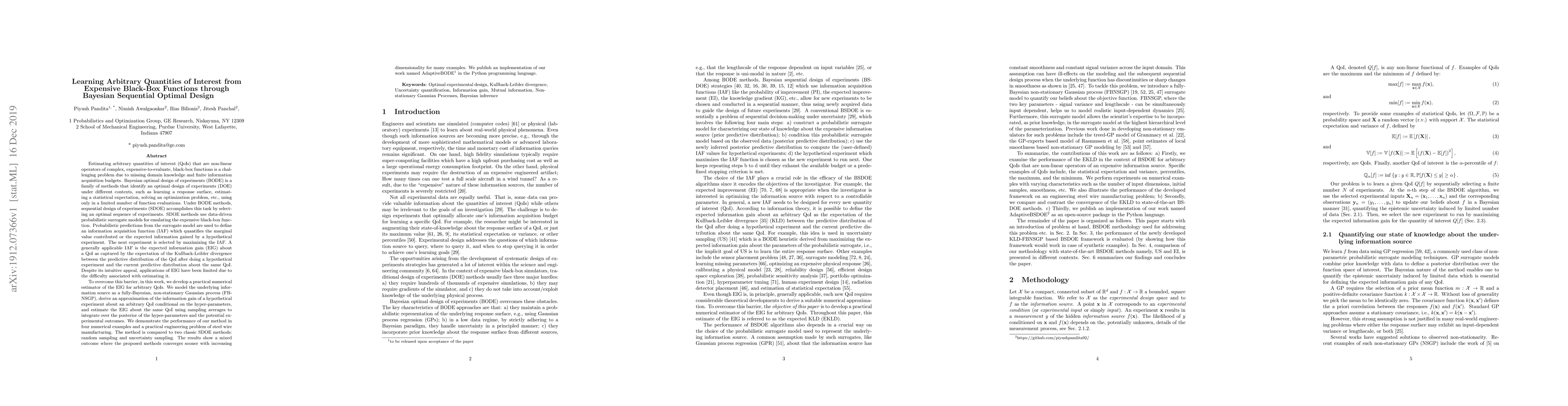 Estimating arbitrary quantities of interest (QoIs) that are non-linear operators of complex, expensive-to-evaluate, black-box functions is a challenging problem due to missing domain knowledge and finite budgets. Bayesian optimal design of experiments (BODE) is a family of methods that identify an optimal design of experiments (DOE) under different contexts, using only in a limited number of function evaluations. Under BODE methods, sequential design of experiments (SDOE) accomplishes this task by selecting an optimal sequence of experiments while using data-driven probabilistic surrogate models instead of the expensive black-box function. Probabilistic predictions from the surrogate model are used to define an information acquisition function (IAF) which quantifies the marginal value contributed or the expected information gained by a hypothetical experiment. The next experiment is selected by maximizing the IAF. A generally applicable IAF is the expected information gain (EIG) about a QoI as captured by the expectation of the Kullback-Leibler divergence between the predictive distribution of the QoI after doing a hypothetical experiment and the current predictive distribution about the same QoI. We model the underlying information source as a fully-Bayesian, non-stationary Gaussian process (FBNSGP), and derive an approximation of the information gain of a hypothetical experiment about an arbitrary QoI conditional on the hyper-parameters The EIG about the same QoI is estimated by sample averages to integrate over the posterior of the hyper-parameters and the potential experimental outcomes. We demonstrate the performance of our method in four numerical examples and a practical engineering problem of steel wire manufacturing. The method is compared to two classic SDOE methods: random sampling and uncertainty sampling.