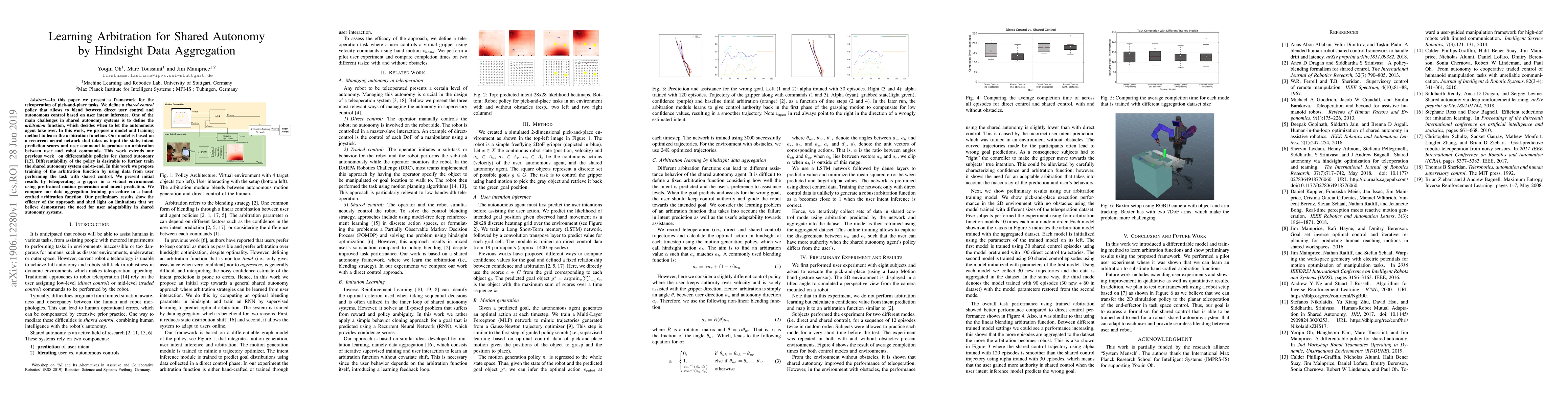In this paper we present a framework for the teleoperation of pick-and-place tasks. We define a shared control policy that allows to blend between direct user control and autonomous control based on user intent inference. One of the main challenges in shared autonomy systems is to define the arbitration function, which decides when to let the autonomous agent take over. In this work, we propose a model and training method to learn the arbitration function. Our model is based on a recurrent neural network that takes as input the state, intent prediction scores and user command to produce an arbitration between user and robot commands. This work extends our previous work on differentiable policies for shared autonomy. Differentiability of the policy is desirable to further train the shared autonomy system end-to-end. In this work we propose training of the arbitration function by using data from user performing the task with shared control. We present initial results by teleoperating a gripper in a virtual environment using pre-trained motion generation and intent prediction. We compare our data aggregation training procedure to a handcrafted arbitration function. Our preliminary results show the efficacy of the approach and shed light on limitations that we believe demonstrate the need for user adaptability in shared autonomy systems.