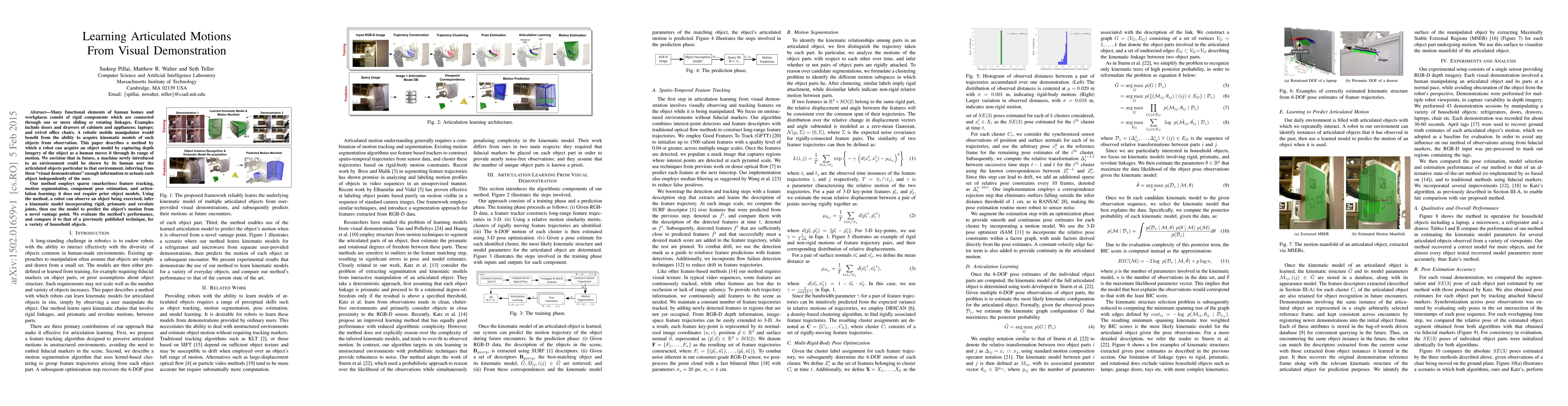 This paper presents a method for a robot to learn kinematic models of articulated objects through visual demonstrations, employing markerless feature tracking and motion segmentation. The robot infers a kinematic model from observed depth imagery and can predict object motion from new perspectives, evaluated against a prior technique.