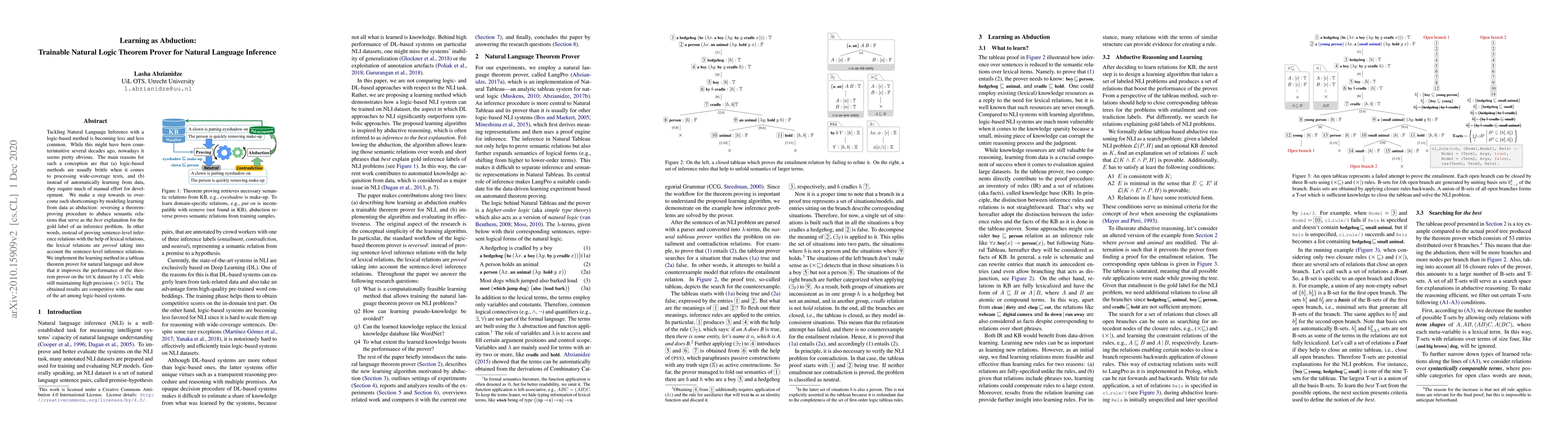 Tackling Natural Language Inference with a logic-based method is becoming less and less common. While this might have been counterintuitive several decades ago, nowadays it seems pretty obvious. The main reasons for such a conception are that (a) logic-based methods are usually brittle when it comes to processing wide-coverage texts, and (b) instead of automatically learning from data, they require much of manual effort for development. We make a step towards to overcome such shortcomings by modeling learning from data as abduction: reversing a theorem-proving procedure to abduce semantic relations that serve as the best explanation for the gold label of an inference problem. In other words, instead of proving sentence-level inference relations with the help of lexical relations, the lexical relations are proved taking into account the sentence-level inference relations. We implement the learning method in a tableau theorem prover for natural language and show that it improves the performance of the theorem prover on the SICK dataset by 1.4% while still maintaining high precision (>94%). The obtained results are competitive with the state of the art among logic-based systems.