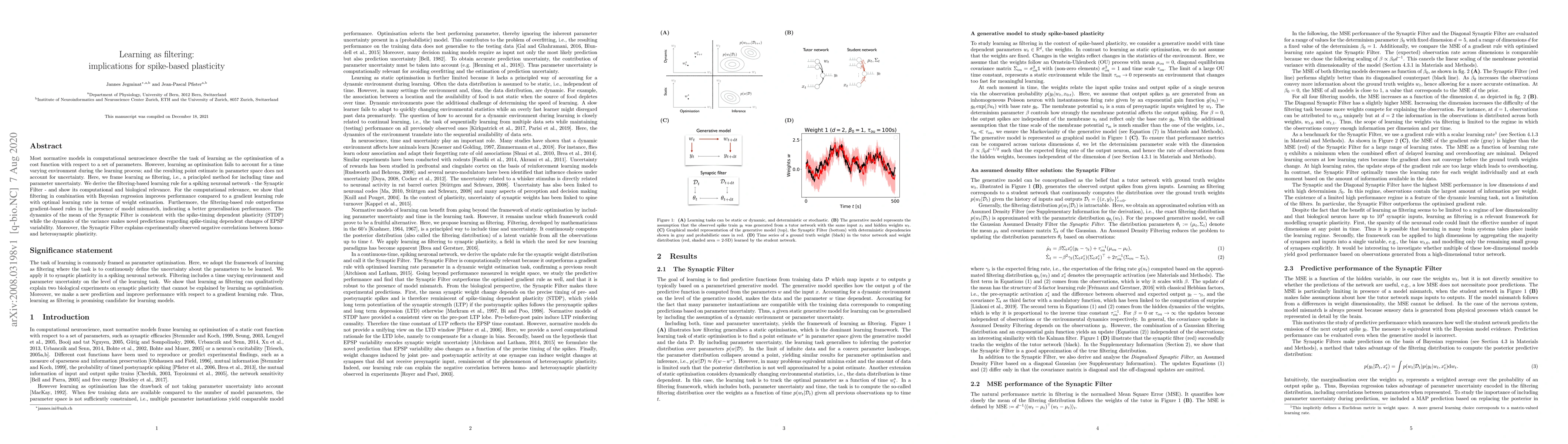 Most normative models in computational neuroscience describe the task of learning as the optimisation of a cost function with respect to a set of parameters. However, learning as optimisation fails to account for a time varying environment during the learning process; and the resulting point estimate in parameter space does not account for uncertainty. Here, we frame learning as filtering, i.e., a principled method for including time and parameter uncertainty. We derive the filtering-based learning rule for a spiking neuronal network - the Synaptic Filter - and show its computational and biological relevance. For the computational relevance, we show that filtering in combination with Bayesian regression improves performance compared to a gradient learning rule with optimal learning rate in terms of weight estimation. Furthermore, the filtering-based rule outperforms gradient-based rules in the presence of model mismatch, indicating a better generalisation performance. The dynamics of the mean of the Synaptic Filter is consistent with the spike-timing dependent plasticity (STDP) while the dynamics of the variance makes novel predictions regarding spike-timing dependent changes of EPSP variability. Moreover, the Synaptic Filter explains experimentally observed negative correlations between homo- and heterosynaptic plasticity.