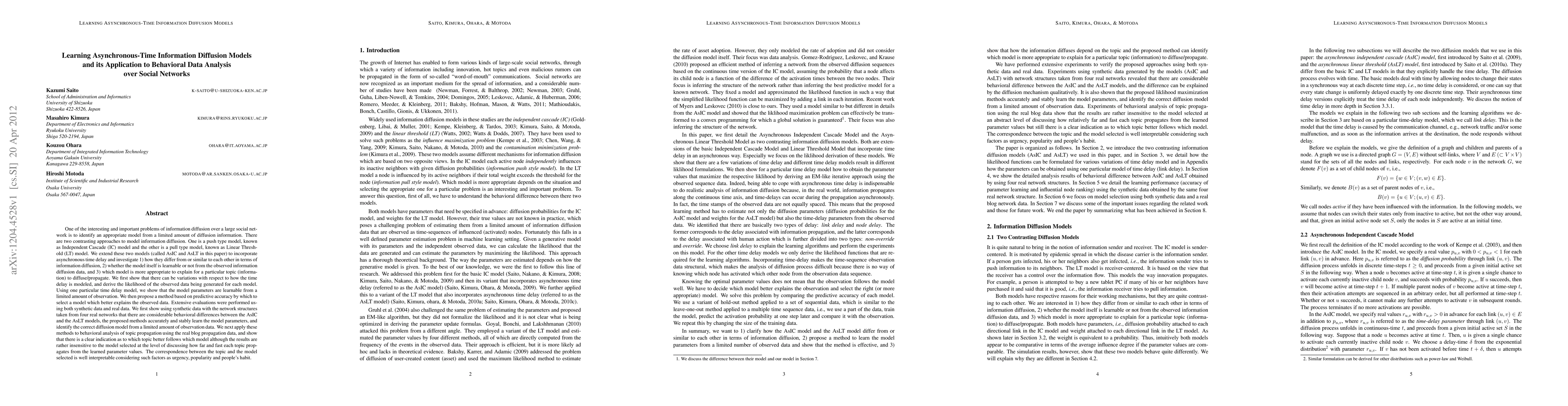 One of the interesting and important problems of information diffusion over a large social network is to identify an appropriate model from a limited amount of diffusion information. There are two contrasting approaches to model information diffusion: a push type model known as Independent Cascade (IC) model and a pull type model known as Linear Threshold (LT) model. We extend these two models (called AsIC and AsLT in this paper) to incorporate asynchronous time delay and investigate 1) how they differ from or similar to each other in terms of information diffusion, 2) whether the model itself is learnable or not from the observed information diffusion data, and 3) which model is more appropriate to explain for a particular topic (information) to diffuse/propagate. We first show there can be variations with respect to how the time delay is modeled, and derive the likelihood of the observed data being generated for each model. Using one particular time delay model, we show the model parameters are learnable from a limited amount of observation. We then propose a method based on predictive accuracy by which to select a model which better explains the observed data. Extensive evaluations were performed. We first show using synthetic data with the network structures taken from real networks that there are considerable behavioral differences between the AsIC and the AsLT models, the proposed methods accurately and stably learn the model parameters, and identify the correct diffusion model from a limited amount of observation data. We next apply these methods to behavioral analysis of topic propagation using the real blog propagation data, and show there is a clear indication as to which topic better follows which model although the results are rather insensitive to the model selected at the level of discussing how far and fast each topic propagates from the learned parameter values.