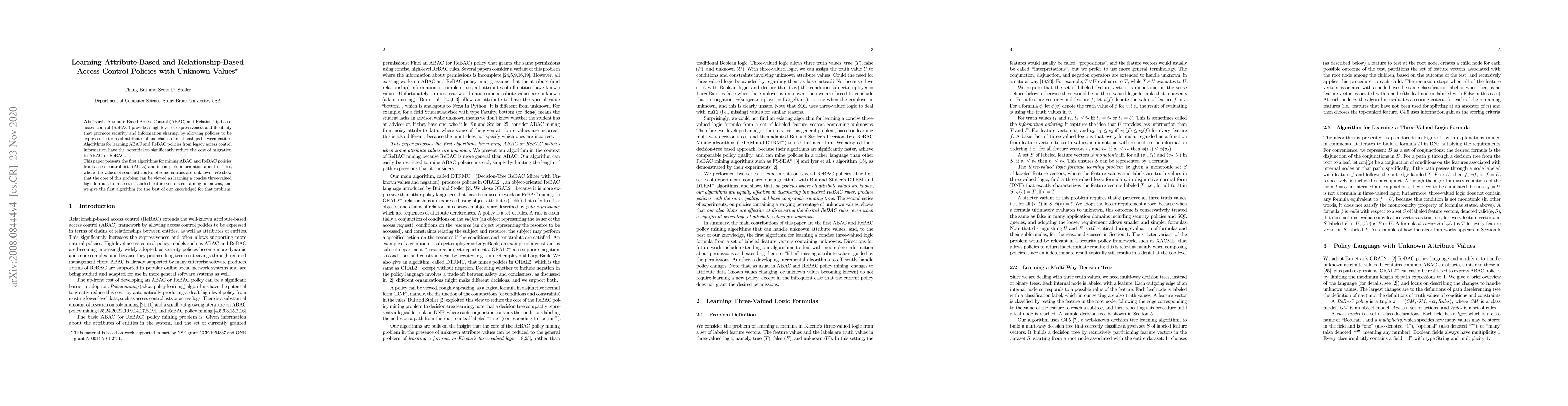 This paper introduces algorithms for learning Attribute-Based Access Control (ABAC) and Relationship-Based Access Control (ReBAC) policies from incomplete access control data, where some attribute values are unknown. It presents the first approach to mine these policies by formulating the problem as learning a three-valued logic formula from labeled feature vectors, including unknowns.