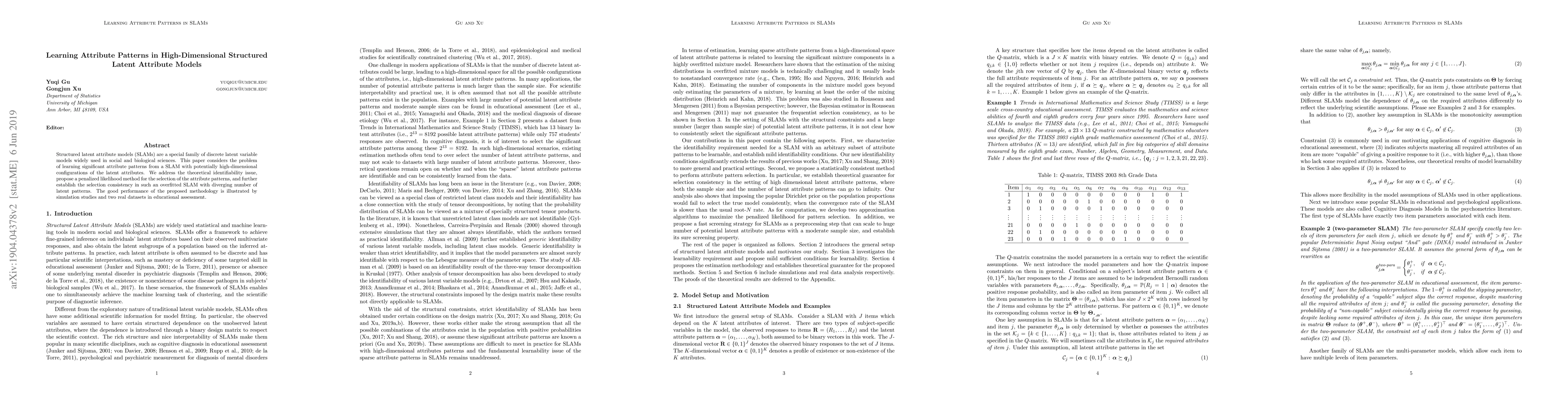 This paper develops a penalized likelihood method for identifying significant attribute patterns in high-dimensional structured latent attribute models, addressing theoretical identifiability and establishing selection consistency. Simulation studies and real-world educational assessment datasets demonstrate the method's effectiveness.