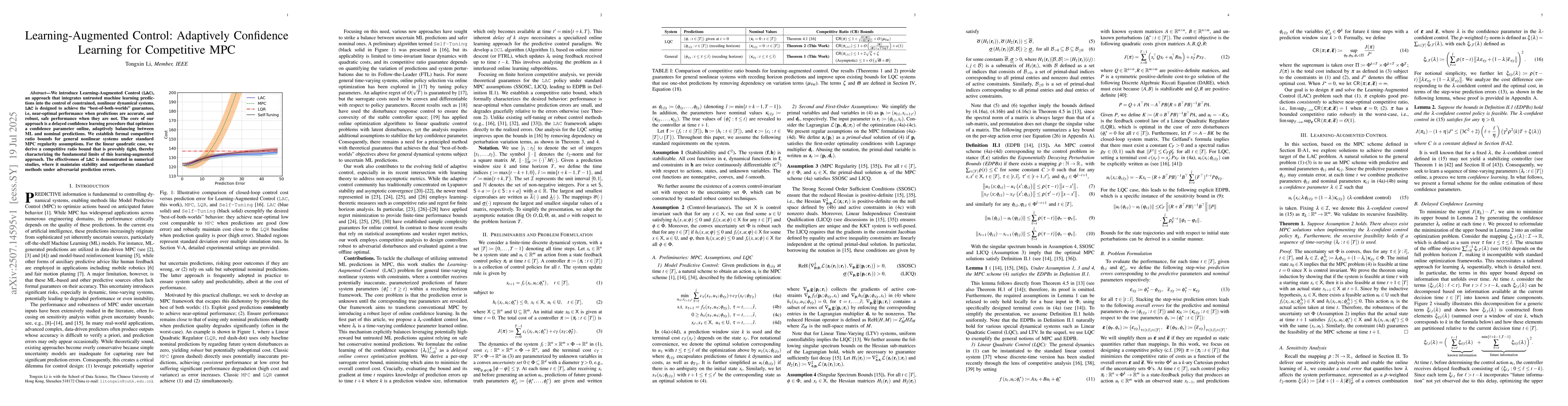 We introduce Learning-Augmented Control (LAC), an approach that integrates untrusted machine learning predictions into the control of constrained, nonlinear dynamical systems. LAC is designed to achieve the "best-of-both-worlds" guarantees, i.e, near-optimal performance when predictions are accurate, and robust, safe performance when they are not. The core of our approach is a delayed confidence learning procedure that optimizes a confidence parameter online, adaptively balancing between ML and nominal predictions. We establish formal competitive ratio bounds for general nonlinear systems under standard MPC regularity assumptions. For the linear quadratic case, we derive a competitive ratio bound that is provably tight, thereby characterizing the fundamental limits of this learning-augmented approach. The effectiveness of LAC is demonstrated in numerical studies, where it maintains stability and outperforms standard methods under adversarial prediction errors.