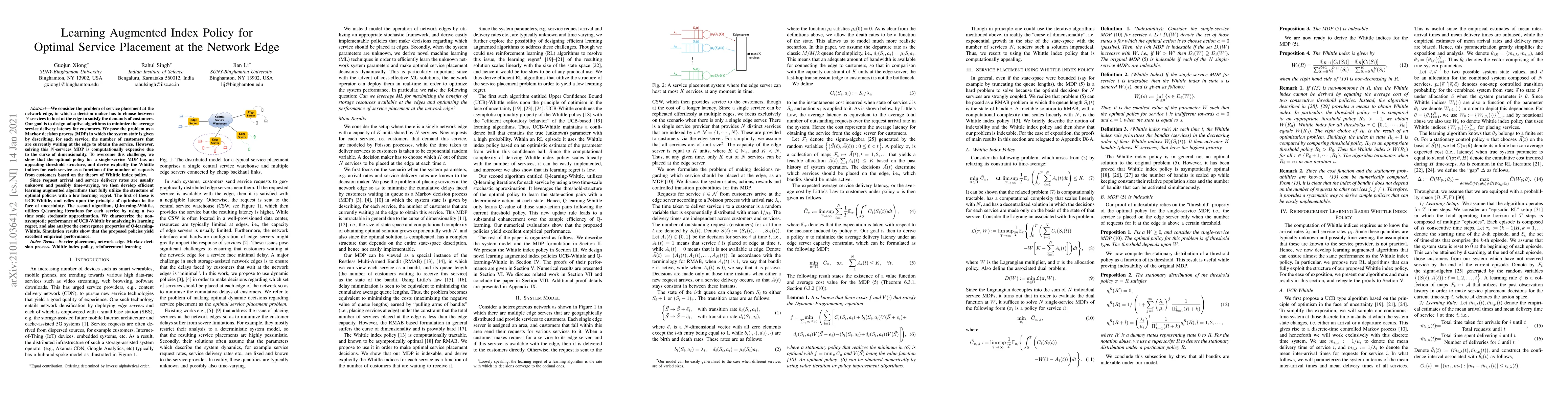 We consider the problem of service placement at the network edge, in which a decision maker has to choose between $N$ services to host at the edge to satisfy the demands of customers. Our goal is to design adaptive algorithms to minimize the average service delivery latency for customers. We pose the problem as a Markov decision process (MDP) in which the system state is given by describing, for each service, the number of customers that are currently waiting at the edge to obtain the service. However, solving this $N$-services MDP is computationally expensive due to the curse of dimensionality. To overcome this challenge, we show that the optimal policy for a single-service MDP has an appealing threshold structure, and derive explicitly the Whittle indices for each service as a function of the number of requests from customers based on the theory of Whittle index policy. Since request arrival and service delivery rates are usually unknown and possibly time-varying, we then develop efficient learning augmented algorithms that fully utilize the structure of optimal policies with a low learning regret. The first of these is UCB-Whittle, and relies upon the principle of optimism in the face of uncertainty. The second algorithm, Q-learning-Whittle, utilizes Q-learning iterations for each service by using a two time scale stochastic approximation. We characterize the non-asymptotic performance of UCB-Whittle by analyzing its learning regret, and also analyze the convergence properties of Q-learning-Whittle. Simulation results show that the proposed policies yield excellent empirical performance.