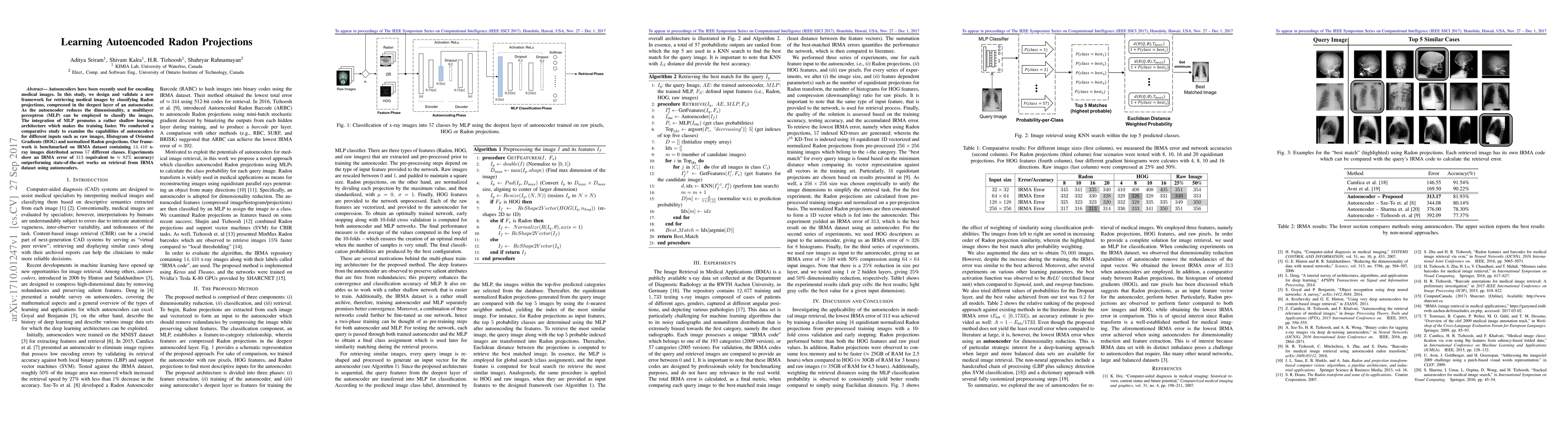 Autoencoders have been recently used for encoding medical images. In this study, we design and validate a new framework for retrieving medical images by classifying Radon projections, compressed in the deepest layer of an autoencoder. As the autoencoder reduces the dimensionality, a multilayer perceptron (MLP) can be employed to classify the images. The integration of MLP promotes a rather shallow learning architecture which makes the training faster. We conducted a comparative study to examine the capabilities of autoencoders for different inputs such as raw images, Histogram of Oriented Gradients (HOG) and normalized Radon projections. Our framework is benchmarked on IRMA dataset containing $14,410$ x-ray images distributed across $57$ different classes. Experiments show an IRMA error of $313$ (equivalent to $\approx 82\%$ accuracy) outperforming state-of-the-art works on retrieval from IRMA dataset using autoencoders.