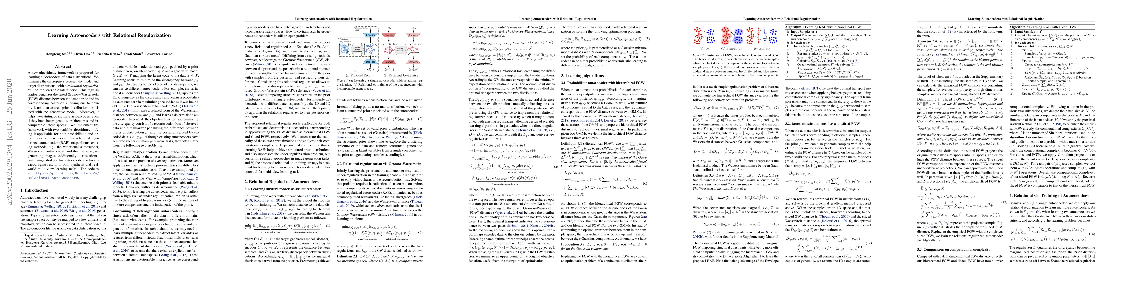 This paper introduces a new framework for learning autoencoders with relational regularization, which minimizes the discrepancy between model and target distributions while penalizing the fused Gromov-Wasserstein distance in the latent space. This approach enables flexible learning of structured priors and co-training of autoencoders with different architectures, outperforming existing methods in image generation and multi-view learning tasks.