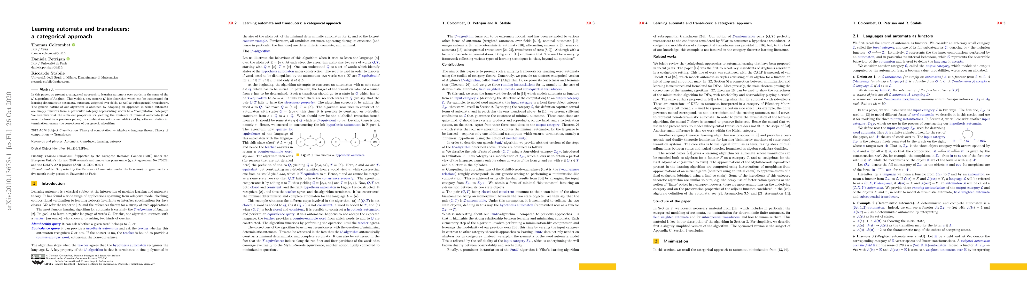 This paper introduces a categorical framework for learning automata and transducers, specifically leveraging the $L^*$-algorithm. It presents a generic algorithm adaptable for various types of automata and transducers, demonstrating correctness through the properties of minimal automata and termination conditions.