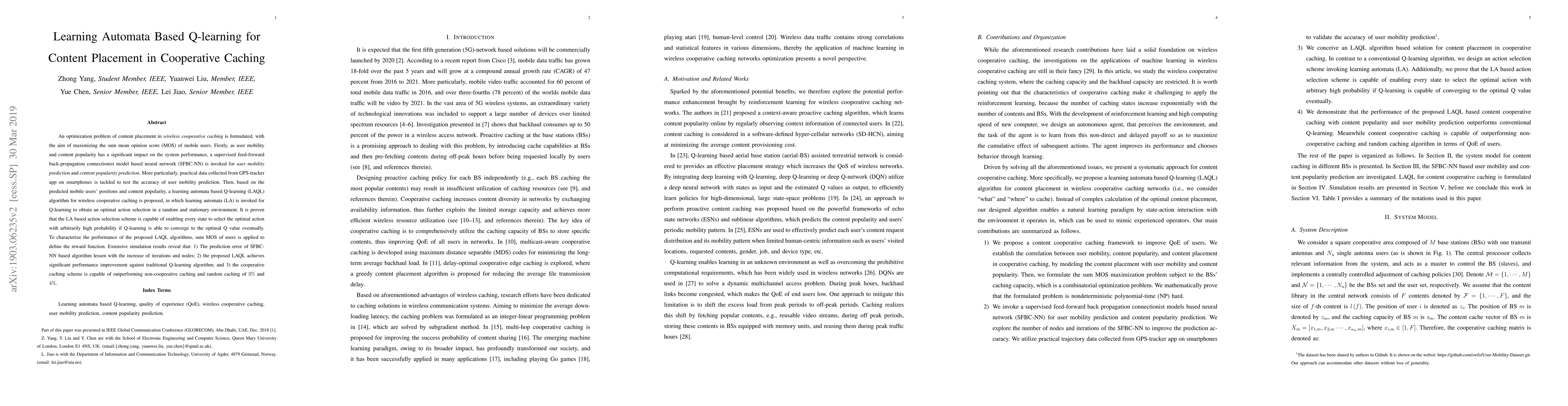 This paper proposes a learning automata-based Q-learning (LAQL) algorithm for optimizing content placement in cooperative caching to maximize the sum mean opinion score (MOS) of mobile users. It employs a supervised feed-forward back-propagation connectionist model for user mobility and content popularity prediction, and demonstrates significant performance improvements over traditional Q-learning through extensive simulations.