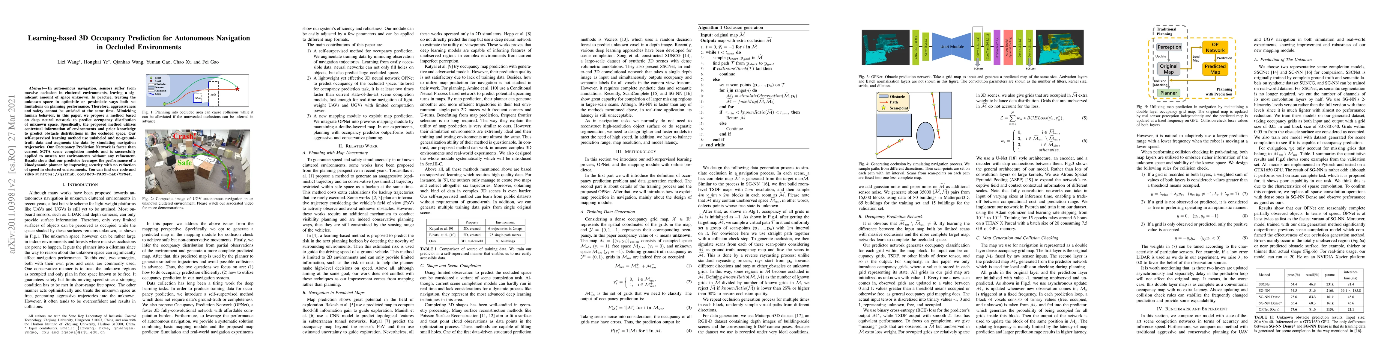 This paper proposes a deep learning method to predict 3D occupancy distributions in occluded environments for autonomous navigation, leveraging contextual information and prior knowledge without requiring labeled data. The approach enhances navigation safety without compromising speed, demonstrating effective real-time planning in cluttered spaces.
