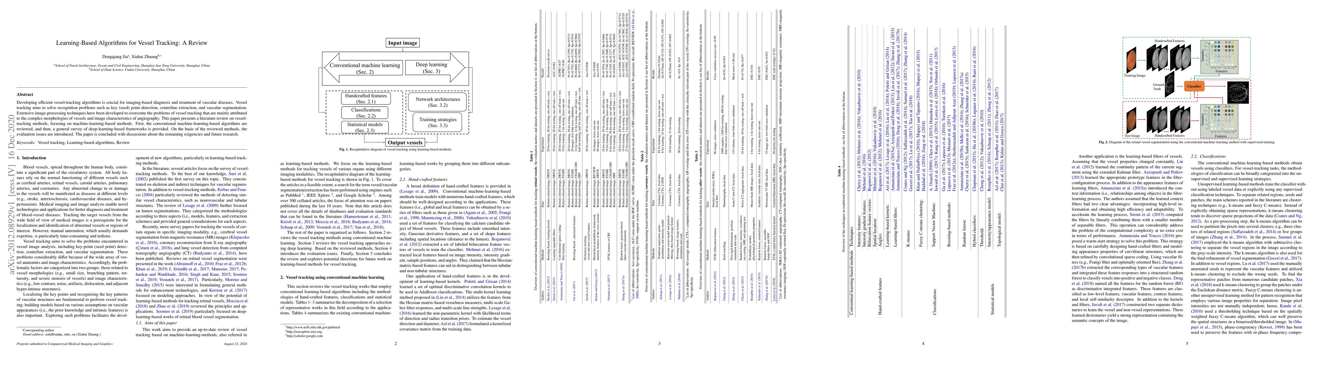 Developing efficient vessel-tracking algorithms is crucial for imaging-based diagnosis and treatment of vascular diseases. Vessel tracking aims to solve recognition problems such as key (seed) point detection, centerline extraction, and vascular segmentation. Extensive image-processing techniques have been developed to overcome the problems of vessel tracking that are mainly attributed to the complex morphologies of vessels and image characteristics of angiography. This paper presents a literature review on vessel-tracking methods, focusing on machine-learning-based methods. First, the conventional machine-learning-based algorithms are reviewed, and then, a general survey of deep-learning-based frameworks is provided. On the basis of the reviewed methods, the evaluation issues are introduced. The paper is concluded with discussions about the remaining exigencies and future research.