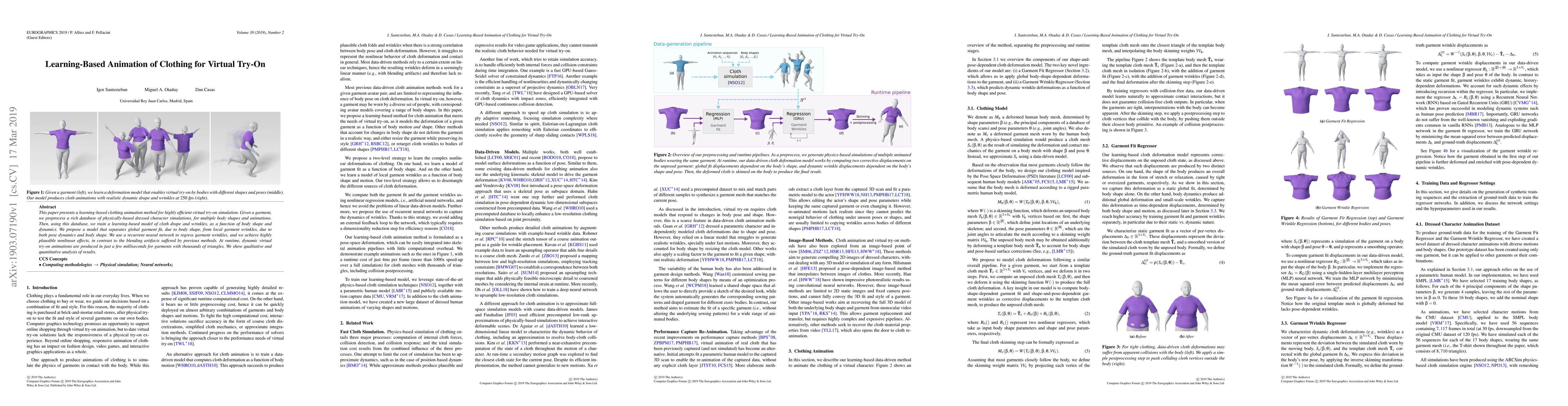 This paper introduces a learning-based method for efficient virtual try-on simulations by training a model to animate clothing based on body shape and dynamic pose. It separates global fit from local wrinkles and achieves plausible nonlinear effects using a recurrent neural network, enabling real-time animations.