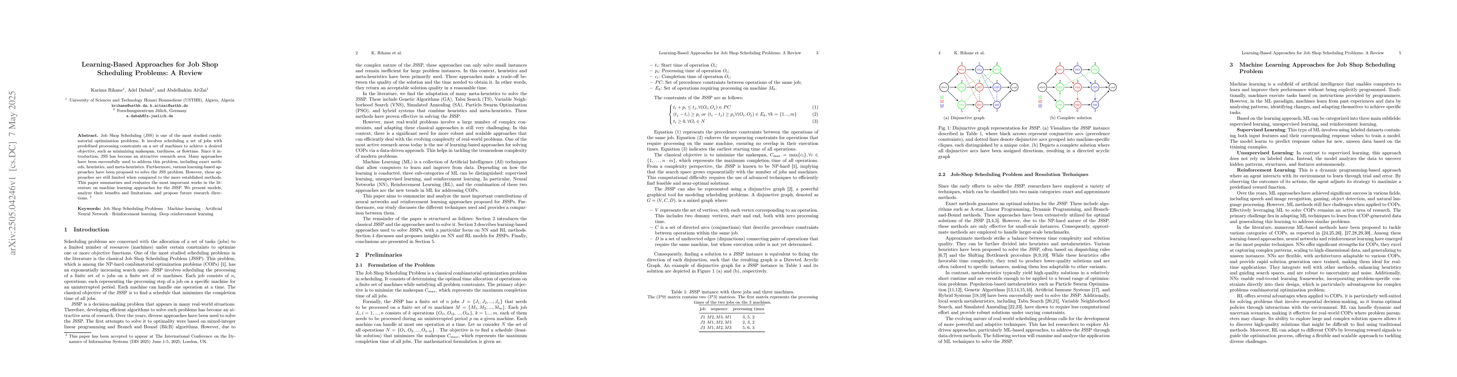 A review of learning-based approaches for Job Shop Scheduling Problems (JSSP) evaluates their effectiveness and proposes future research directions. The study aims to provide a concise overview of the most important machine learning models for solving JSSP.