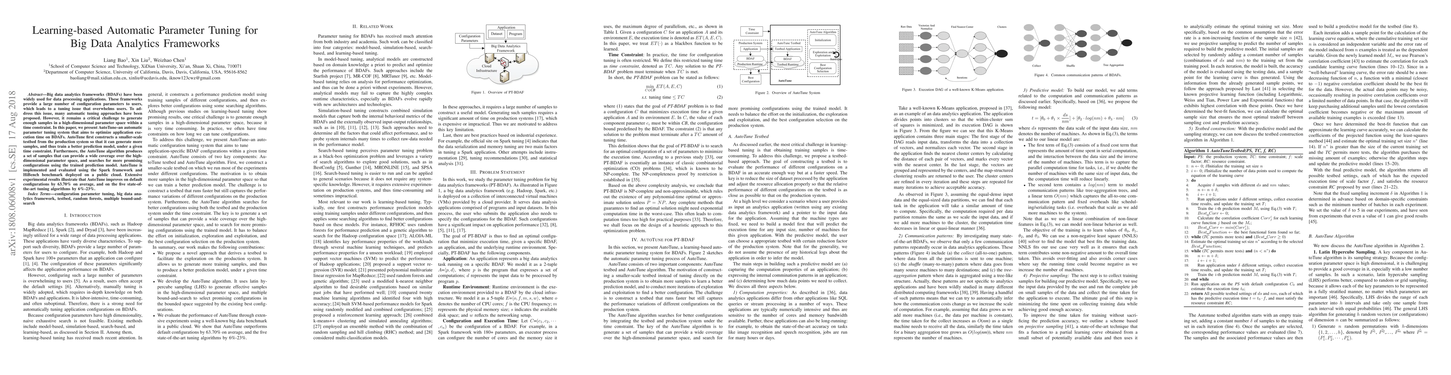 A new automatic parameter tuning system called AutoTune improves big data analytics framework execution times by 63.70% on average, outperforming five state-of-the-art algorithms.