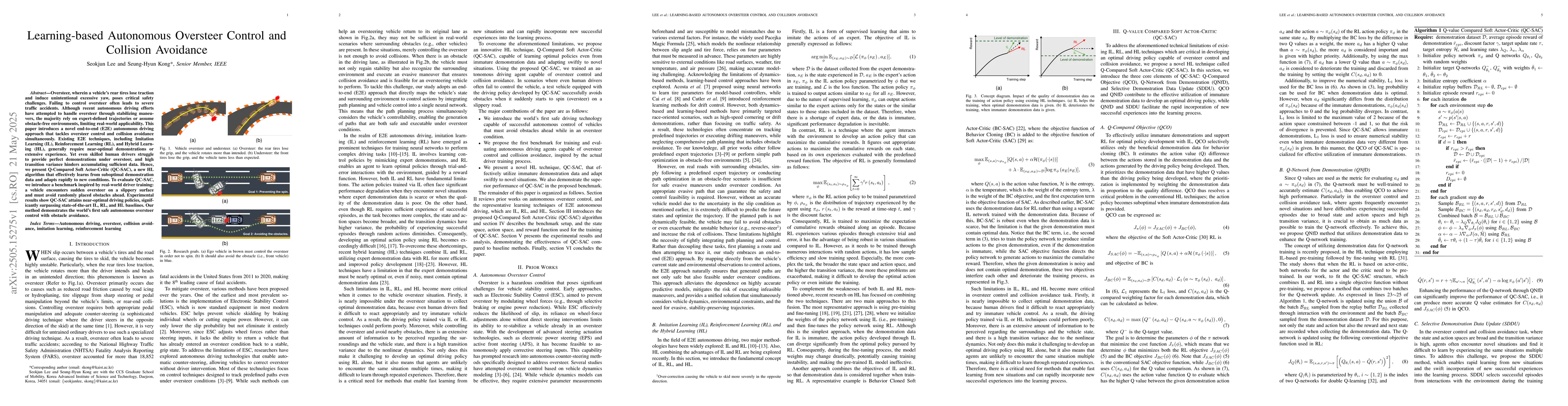 The research introduces QC-SAC, a Hybrid Learning algorithm that combines Imitation Learning and Reinforcement Learning to address oversteer control and collision avoidance simultaneously. It effectively learns from suboptimal demonstration data and adapts rapidly to new conditions.