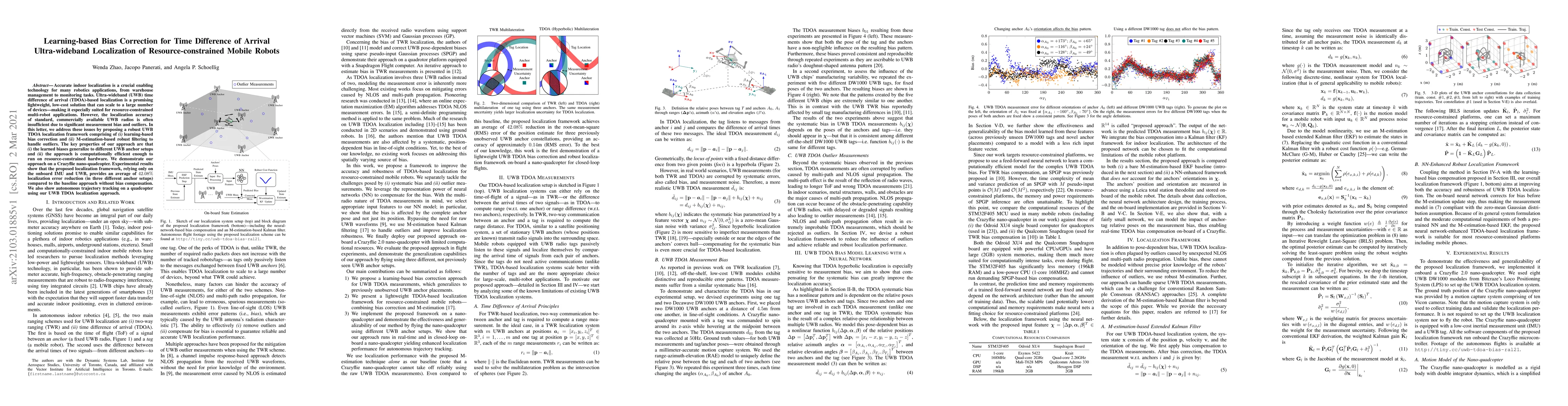 This paper proposes a learning-based bias correction framework for ultra-wideband (UWB) time difference of arrival (TDOA) localization to improve accuracy in resource-constrained mobile robots. The approach includes robust bias correction and M-estimation filtering, demonstrating a 42.08% error reduction in localization compared to baseline methods.