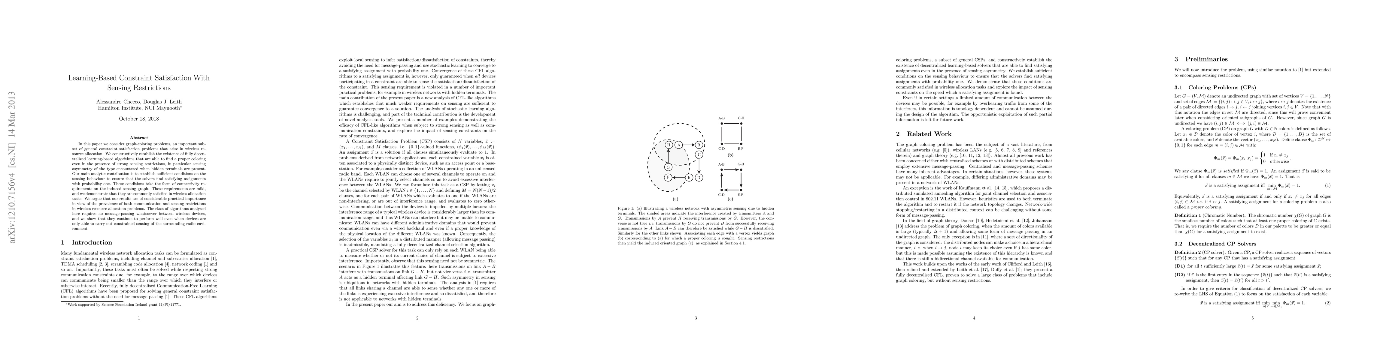 In this paper we consider graph-coloring problems, an important subset of general constraint satisfaction problems that arise in wireless resource allocation. We constructively establish the existence of fully decentralized learning-based algorithms that are able to find a proper coloring even in the presence of strong sensing restrictions, in particular sensing asymmetry of the type encountered when hidden terminals are present. Our main analytic contribution is to establish sufficient conditions on the sensing behaviour to ensure that the solvers find satisfying assignments with probability one. These conditions take the form of connectivity requirements on the induced sensing graph. These requirements are mild, and we demonstrate that they are commonly satisfied in wireless allocation tasks. We argue that our results are of considerable practical importance in view of the prevalence of both communication and sensing restrictions in wireless resource allocation problems. The class of algorithms analysed here requires no message-passing whatsoever between wireless devices, and we show that they continue to perform well even when devices are only able to carry out constrained sensing of the surrounding radio environment.