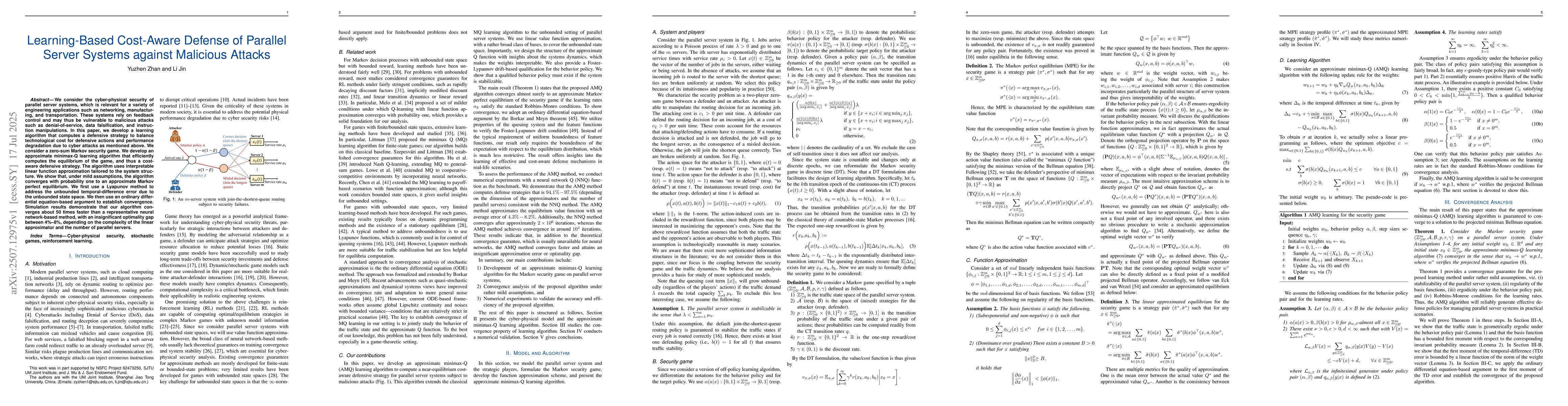 We consider the cyber-physical security of parallel server systems, which is relevant for a variety of engineering applications such as networking, manufacturing, and transportation. These systems rely on feedback control and may thus be vulnerable to malicious attacks such as denial-of-service, data falsification, and instruction manipulations. In this paper, we develop a learning algorithm that computes a defensive strategy to balance technological cost for defensive actions and performance degradation due to cyber attacks as mentioned above. We consider a zero-sum Markov security game. We develop an approximate minimax-Q learning algorithm that efficiently computes the equilibrium of the game, and thus a cost-aware defensive strategy. The algorithm uses interpretable linear function approximation tailored to the system structure. We show that, under mild assumptions, the algorithm converges with probability one to an approximate Markov perfect equilibrium. We first use a Lyapunov method to address the unbounded temporal-difference error due to the unbounded state space. We then use an ordinary differential equation-based argument to establish convergence. Simulation results demonstrate that our algorithm converges about 50 times faster than a representative neural network-based method, with an insignificant optimality gap between 4\%--8\%, depending on the complexity of the linear approximator and the number of parallel servers.