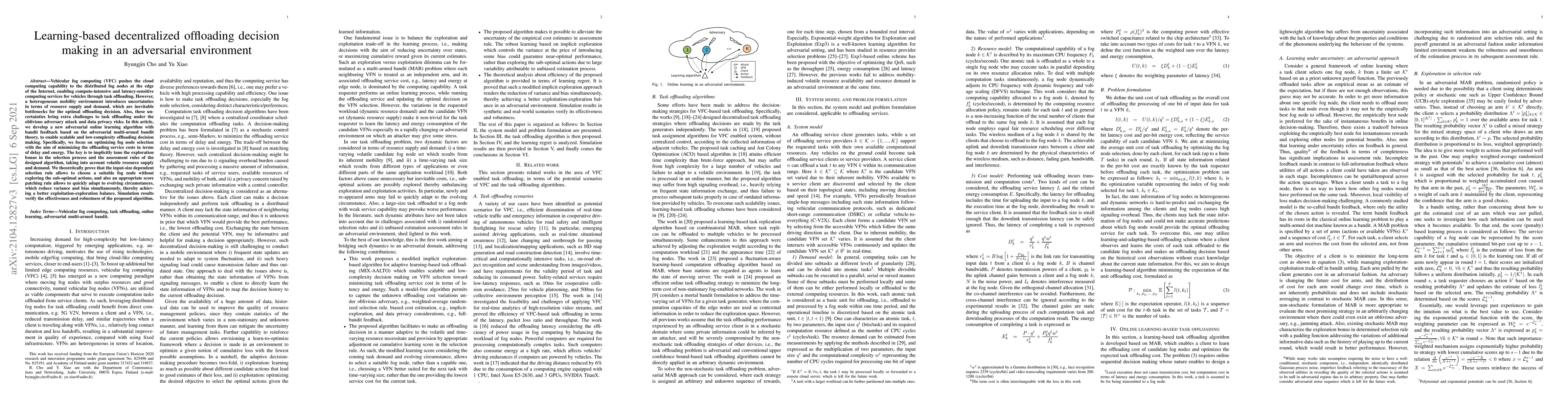 Vehicular fog computing (VFC) pushes the cloud computing capability to the distributed fog nodes at the edge of the Internet, enabling compute-intensive and latency-sensitive computing services for vehicles through task offloading. However, a heterogeneous mobility environment introduces uncertainties in terms of resource supply and demand, which are inevitable bottlenecks for the optimal offloading decision. Also, these uncertainties bring extra challenges to task offloading under the oblivious adversary attack and data privacy risks. In this article, we develop a new adversarial online learning algorithm with bandit feedback based on the adversarial multi-armed bandit theory, to enable scalable and low-complexity offloading decision making. Specifically, we focus on optimizing fog node selection with the aim of minimizing the offloading service costs in terms of delay and energy. The key is to implicitly tune the exploration bonus in the selection process and the assessment rules of the designed algorithm, taking into account volatile resource supply and demand. We theoretically prove that the input-size dependent selection rule allows to choose a suitable fog node without exploring the sub-optimal actions, and also an appropriate score patching rule allows to quickly adapt to evolving circumstances, which reduce variance and bias simultaneously, thereby achieving a better exploitation-exploration balance. Simulation results verify the effectiveness and robustness of the proposed algorithm.