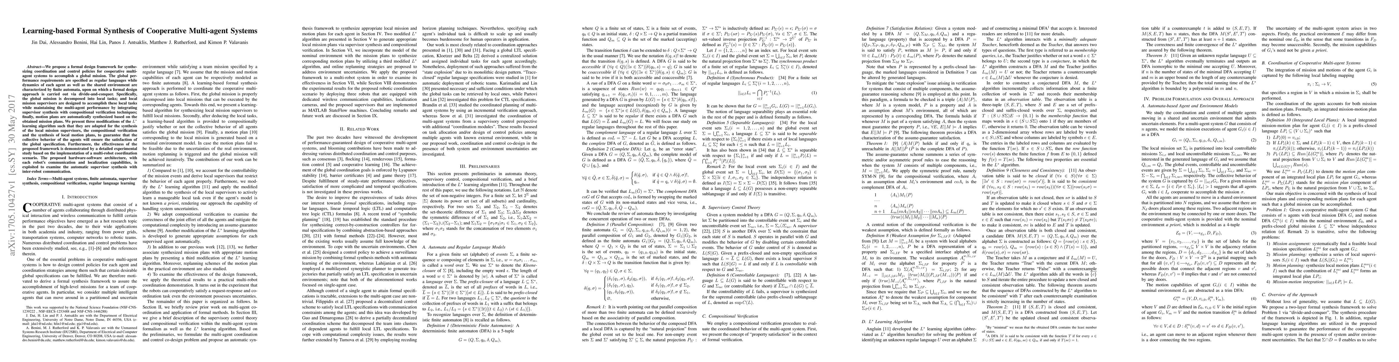 This paper proposes a formal framework for synthesizing coordination and control policies for cooperative multi-agent systems using learning-based algorithms. It decomposes global missions into local tasks and employs modified L* learning algorithms for supervisor synthesis, compositional verification, and motion plan generation, validated through a multi-robot coordination experiment.