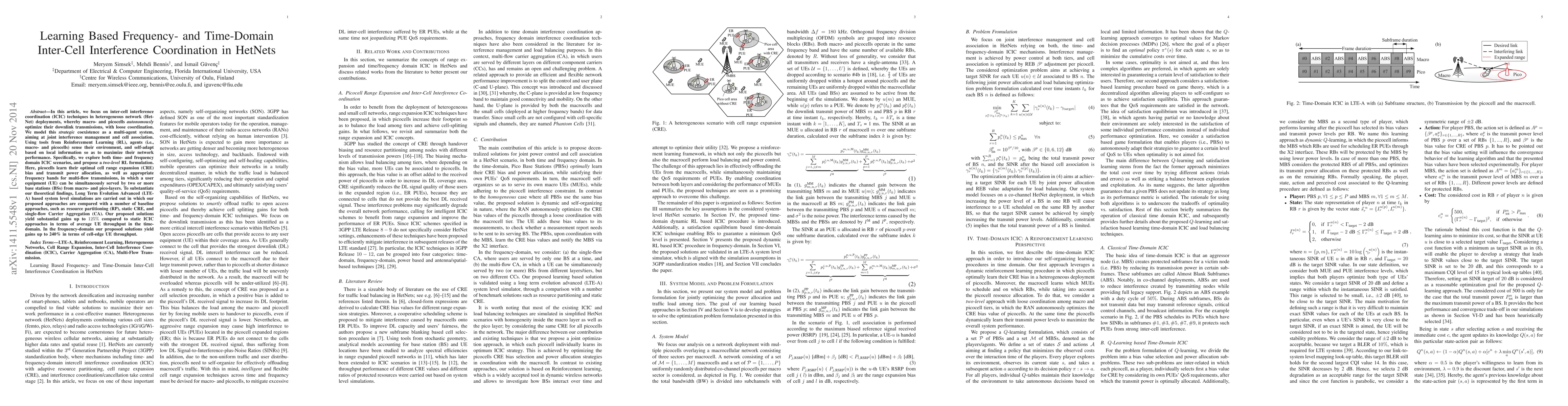 This paper proposes a Reinforcement Learning-based approach for inter-cell interference coordination in heterogeneous networks, optimizing macro and picocell transmissions in both time and frequency domains. Simulation results show significant improvements in user throughput compared to static interference coordination methods.