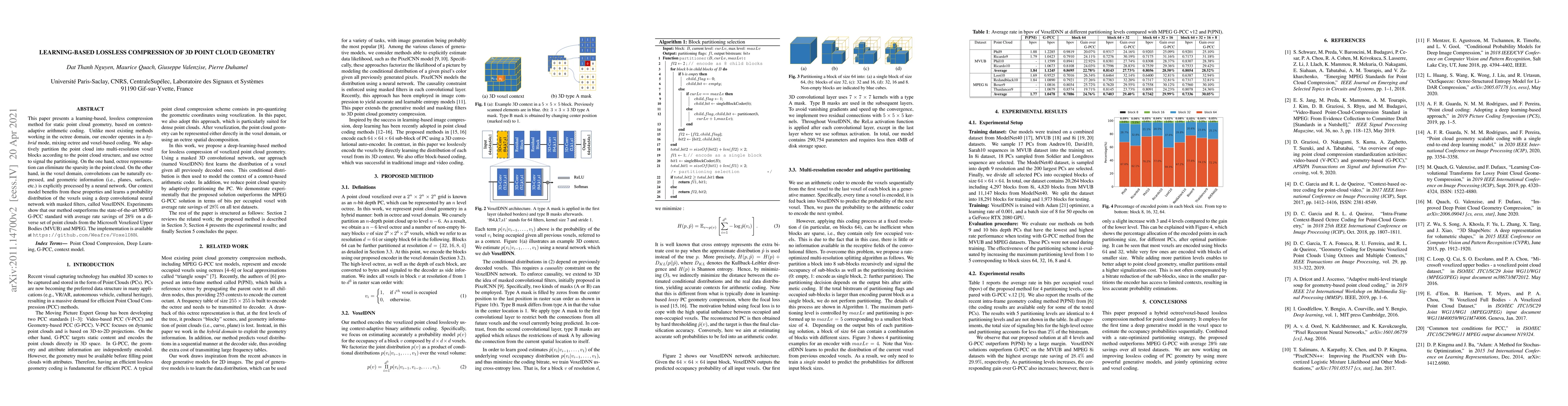 This paper introduces a learning-based, lossless compression method for 3D point cloud geometry using context-adaptive arithmetic coding and a hybrid octree-voxel approach, outperforming the MPEG G-PCC standard by 28% on average. The method employs VoxelDNN to adaptively partition and encode point clouds, leveraging both octree and voxel representations.